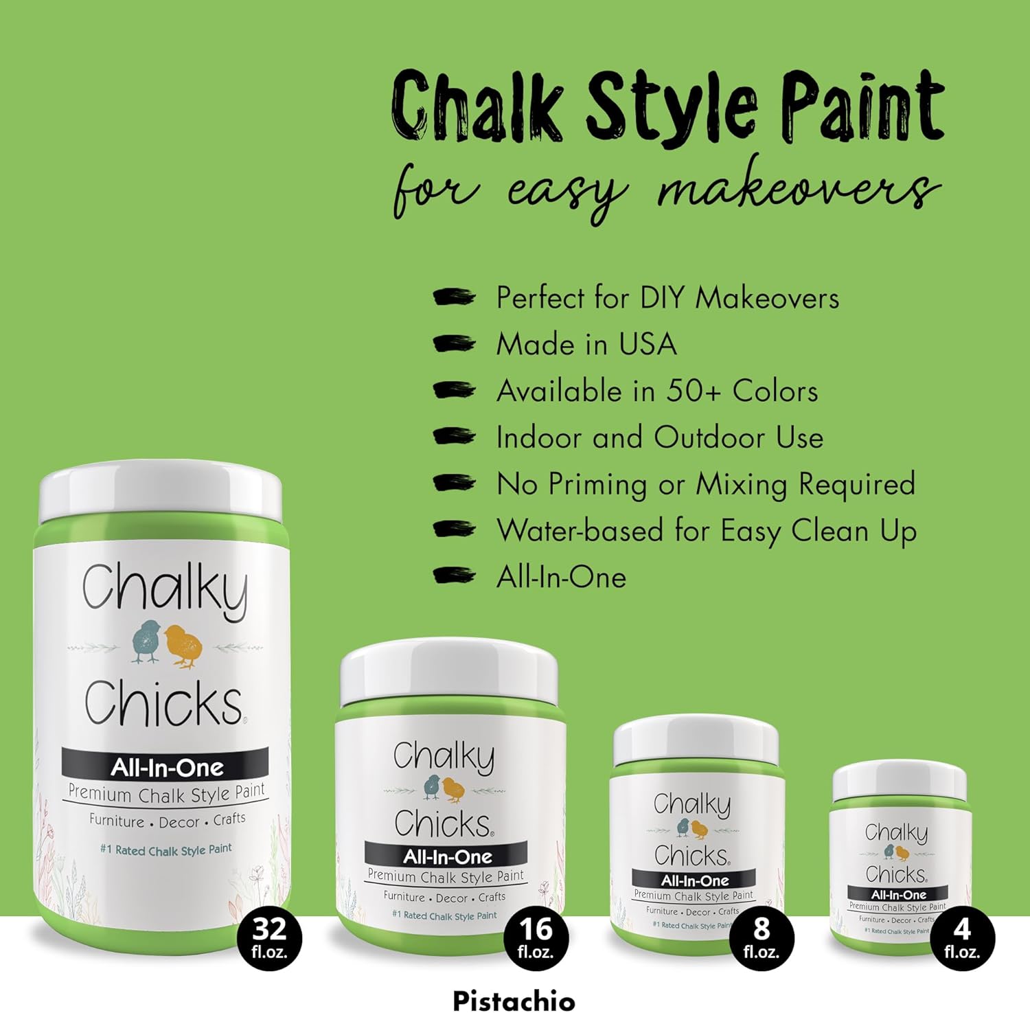Chalky Chicks All-in-One Chalk Paint for Furniture or Cabinet - 8 Fl Oz - Matte Finish Pistachio (Lime Green) for Metal, Wood Furniture Paint - No Sanding All-in-One for Home Decor & Crafts, USA Made