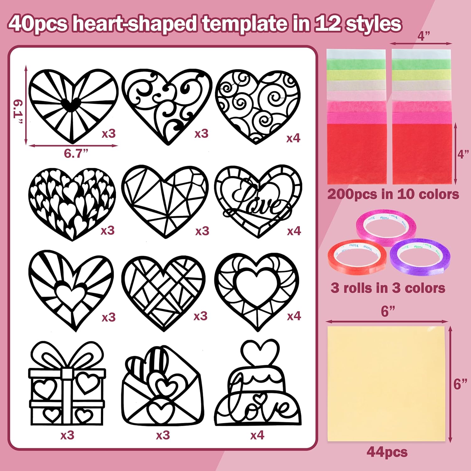 - Fun Valentine’s Day Crafts Kit: Includes 40pcs black heart templates in 12 styles, 200pcs tissue papers in 10 colors, 44pcs transparent self-adhesive templates, 3 rolls of ribbons in 3 colors. This DIY kit allows to create 40pcs colorful heart suncatchers, adding a festive touch to any space