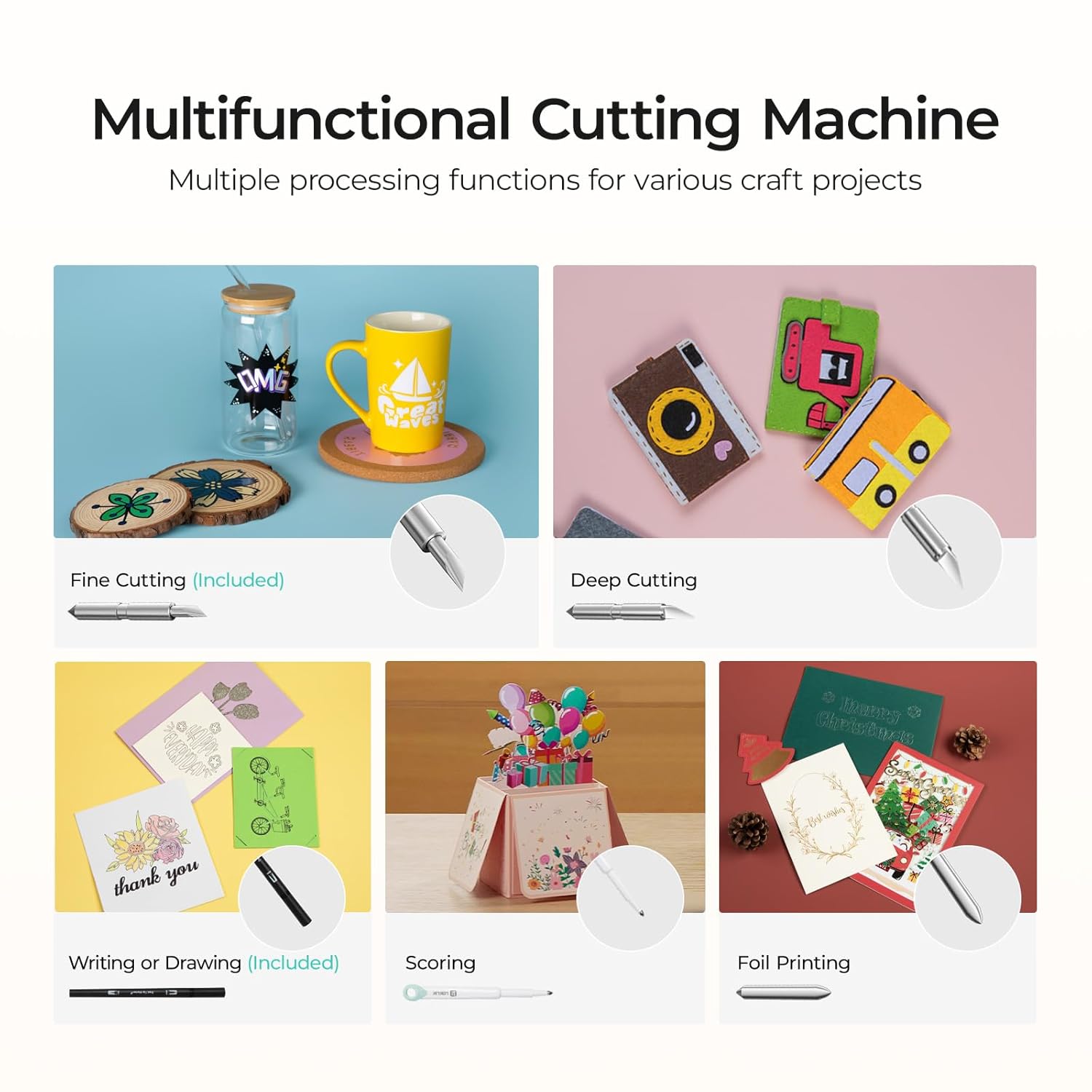 - 5 IN 1 MULTI-FUNCTION: Not only has fine-cutting, writing or drawing functions (tools included), this vinyl cutter machine also compatible with deep cutting, scoring and foil printing (tools sold separately). Whether youβre customizing t-shirts, making intricate cards, scrapbook pages, personalizing 3D boxes, or creating home decor, this machine can truly meet your craft needs and unlimited creativity