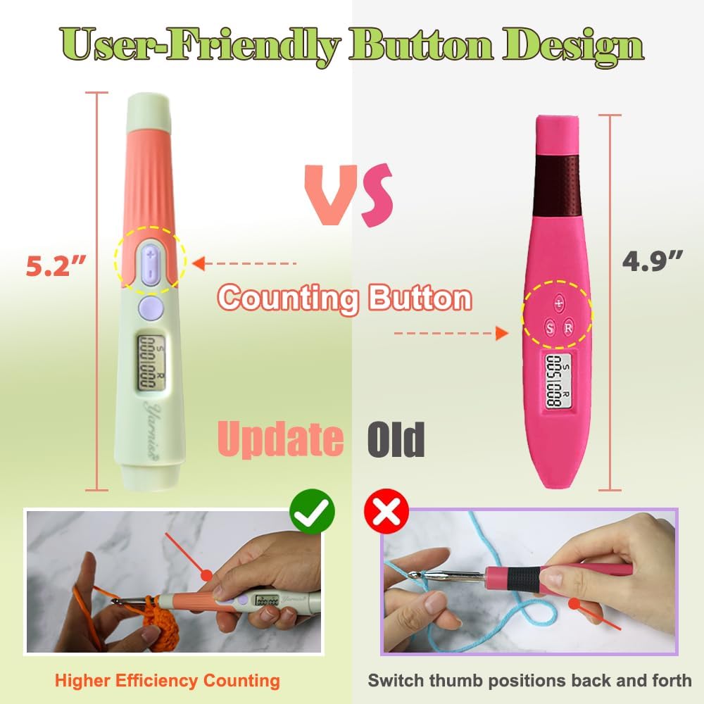 - Intelligent Stitch Counting Device - The digital crochet hooks feature the newest counting device that revolutionizes your crocheting experience. It precisely records the number of stitches and rows as you work, and with the intuitive β+β and β-β buttons, manual adjustments are a breeze. Whether youβre a beginner or a seasoned pro, keeping track of your progress has never been easier.