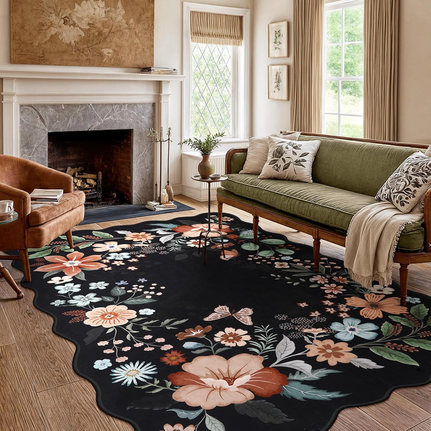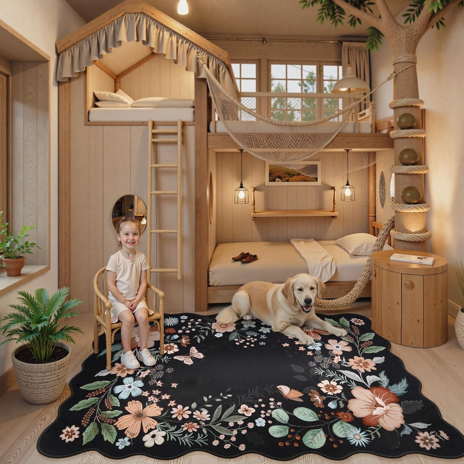 Beeiva 6x9 Rug for Living Room - Scalloped Floral Printed Bedroom Rug Machine Washable Area Rug Soft Area Rug Boho Ultra-Thin Stain Resistant Aesthetic Carpet for Playroom Dorm Office(Black,6x9ft)