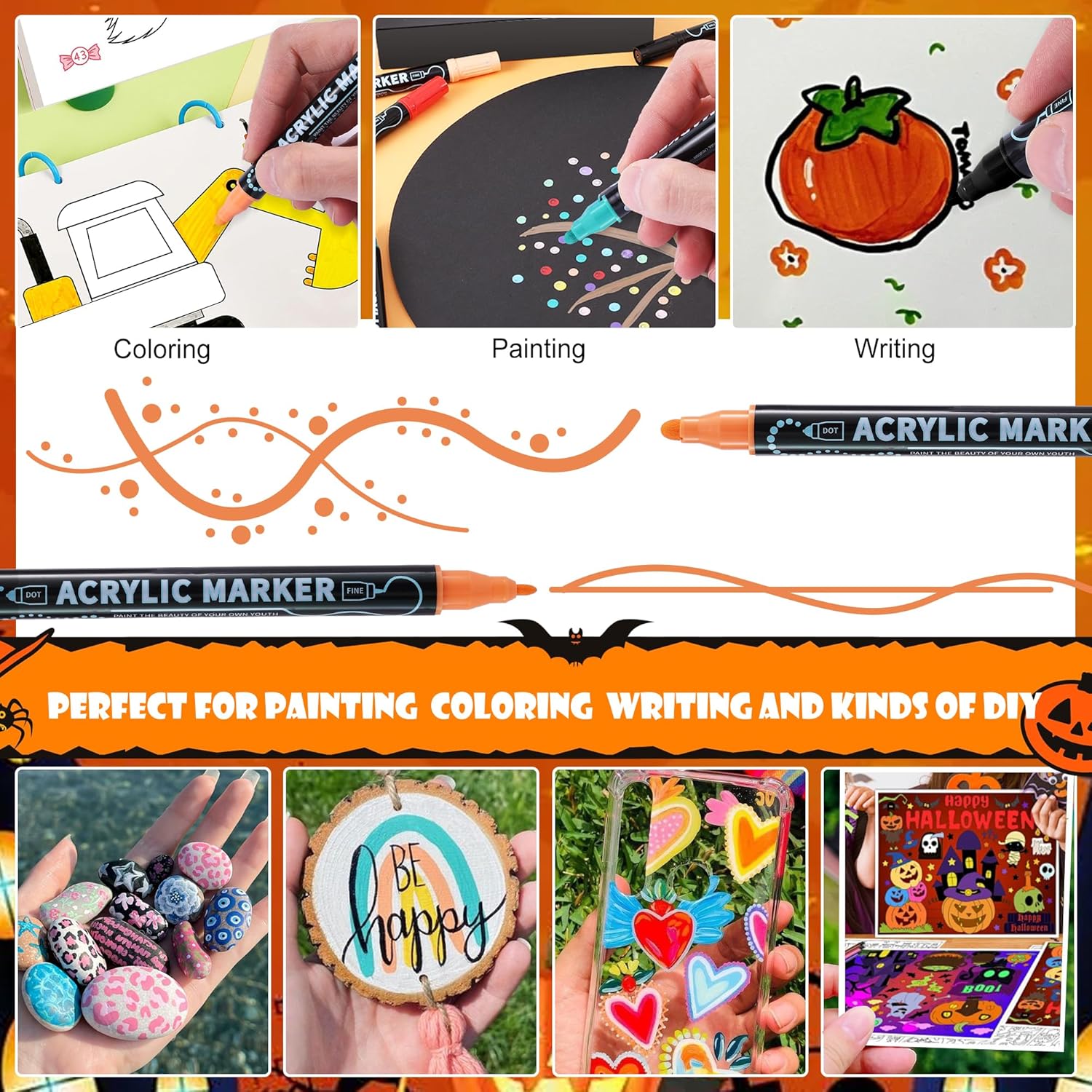 - Widely Used Painting Pens: Our dual-tip acrylic paint pens work on almost any surface, not only paper but also beautifully on rocks, wood, mugs, canvas, fabric, leather, ceramics, tiles, glass, resin, tires, balckboard, window, car, christmas ornament, jar labels, add decoration to graffiti, card making, bullet journal, pumpkin designs, easter eggs, and other smooth or porous surfaces. The The wide uses brings more creative possibilities to your art projects.