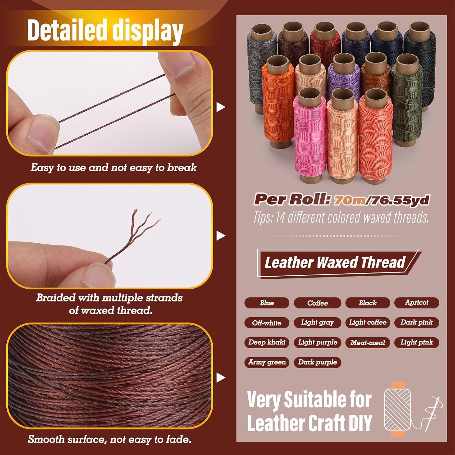 - Waxed Thread for Leather: Leather sewing thread made from braided polyester, 0.55 mm diameter, 70 meters/76 yards, multi-strand woven round waxed thread strong, wear-resistant, include heavy duty needles, to make it easier for you to start leather crafting projects, ideal for leather sewing, stitching, braiding, knotting, beading, binding, necklace and bracelet making