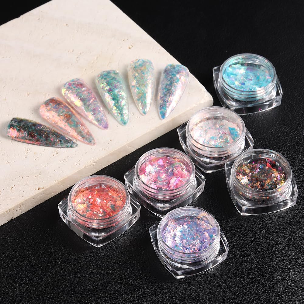 Holographic Iridescent Nail Art Glitter Flakes, 6 Colors Sparkly Ultra-Thin Aurora Foil Nail Art Flakes Designs, Opal Powder Nail Glitters Sequins Acrylic Supplies DIY Manicure Decorations