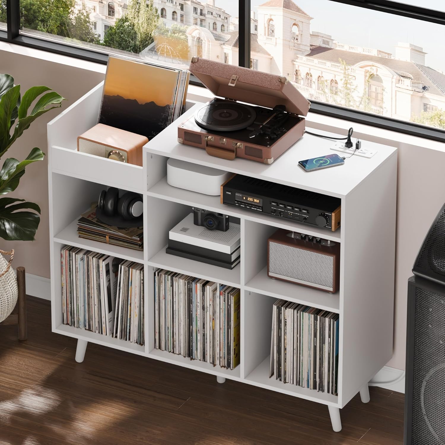 - Mid-century Modern Record Cabinet: The versatile cabinet can be used as a record player stand with vinyl storage, cube storage organizer, bookcase, or display cabinet. Featuring clean lines and neutral tones, it seamlessly integrates with room decor while providing storage solutions for audiophiles and furniture enthusiasts alike. Pairs well with industrial, rustic and modern style