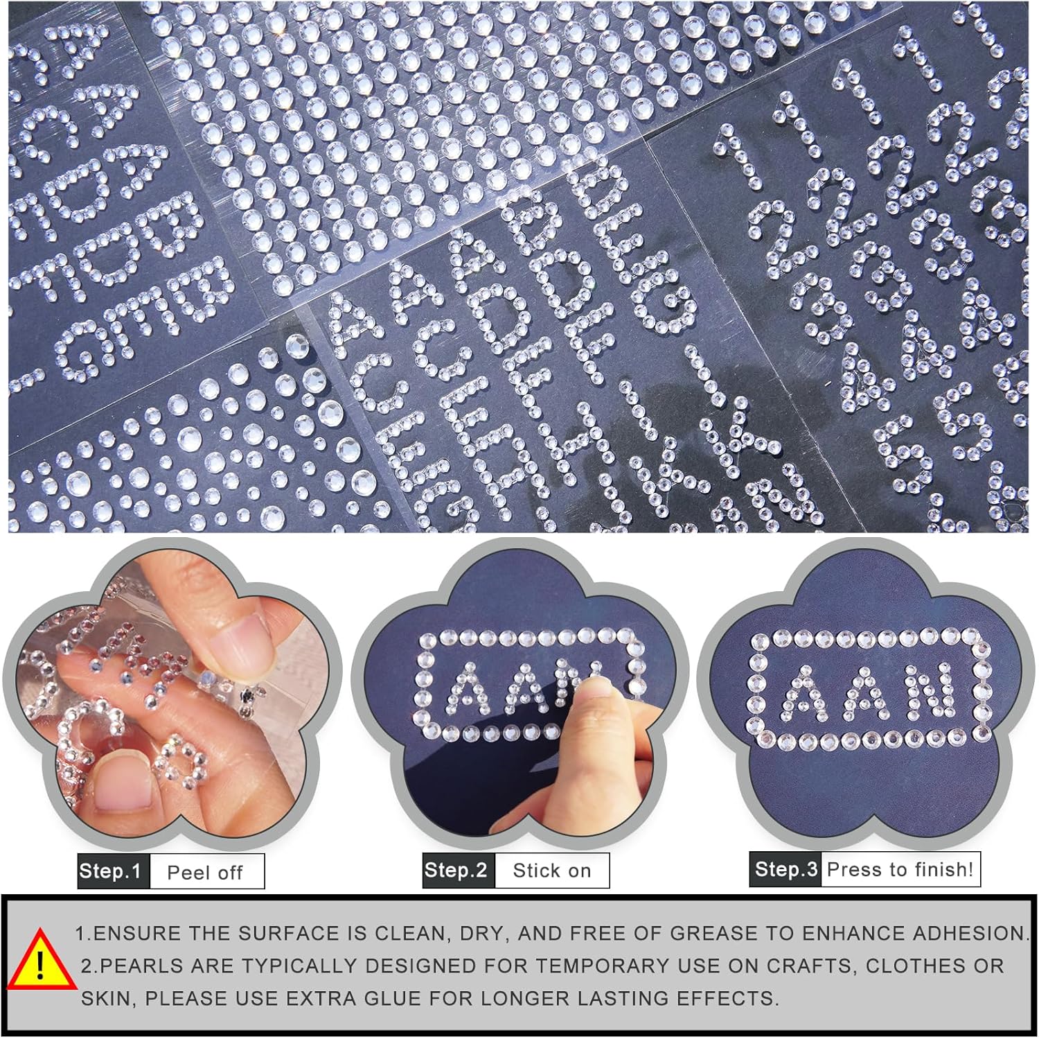 - Multifunctional Rhinestones Stickers: Ready-made alphabet chain shapes with single pearls, used not only for crafts, scrapbooks decoration, cards making but also for hair gems and face gems for music festivals, parties, wedding, festivals, etc.