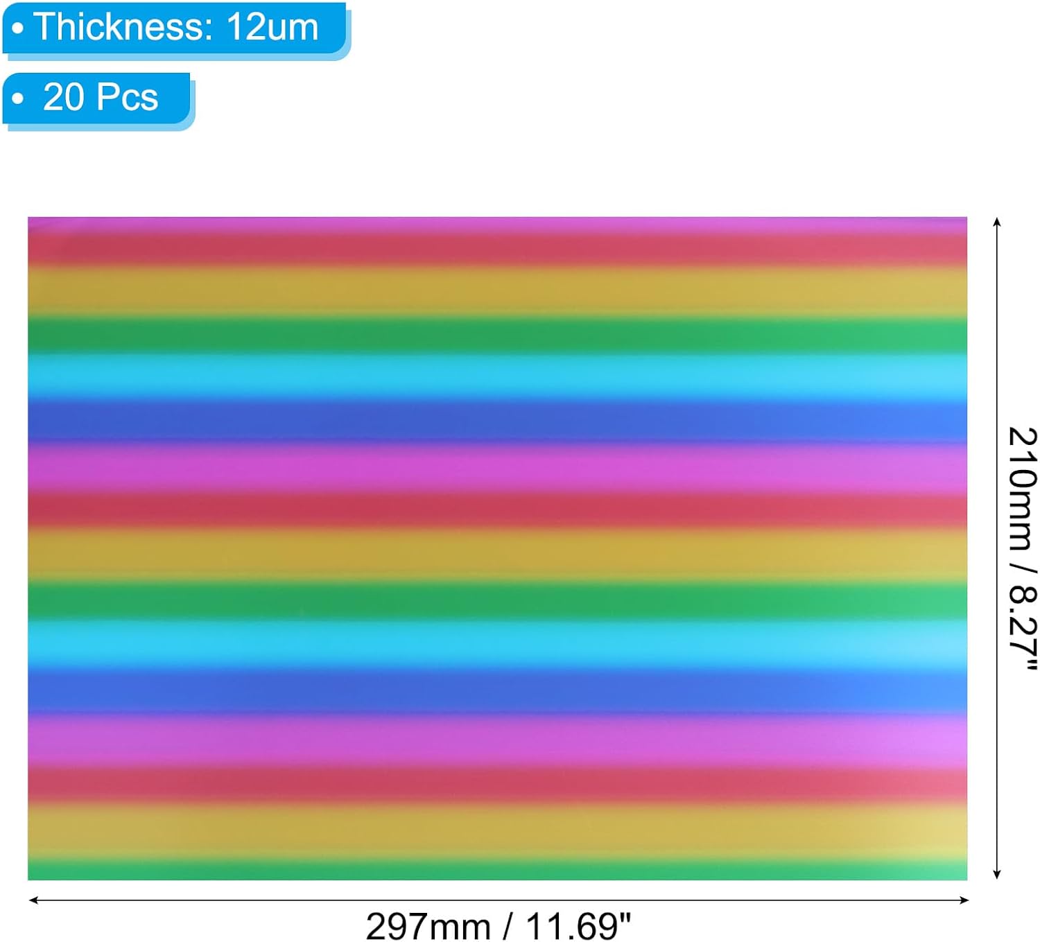 - Specification: Color: Vertical Colorful; Size: 297 x 210mm / 11.69 x 8.27 inch (L*W); Paper Thickness: 12um; Material: PET Plastic; Packing list: 20 Sheets x Hot stamping foil paper