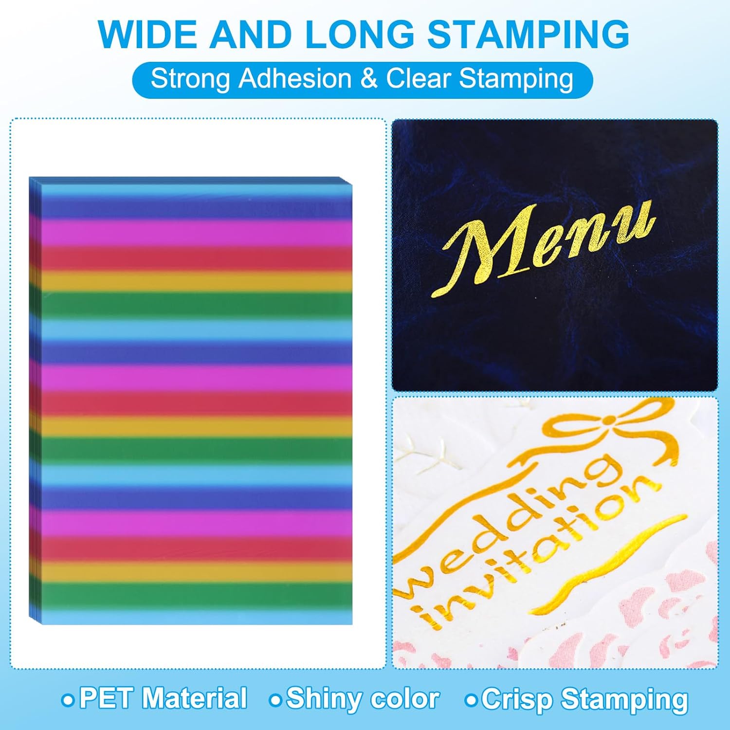 - Advantages: PET plastic material has strong adhesion, clear stamping, bright colors and shiny stamping effect; The stamping foil sheets with a stable and firm texture, which contributes to perfect adhesion and high durability.
