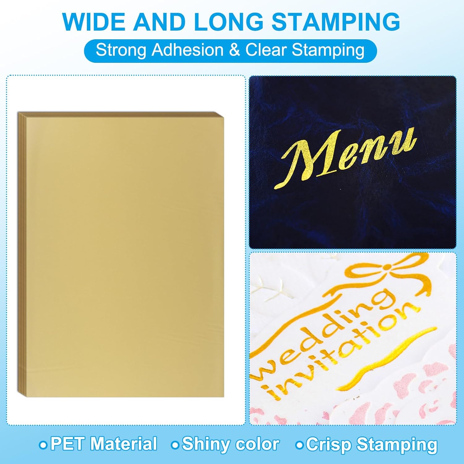 - Advantages: PET plastic material has strong adhesion, clear stamping, bright colors and shiny stamping effect; The stamping foil sheets with a stable and firm texture, which contributes to perfect adhesion and high durability.