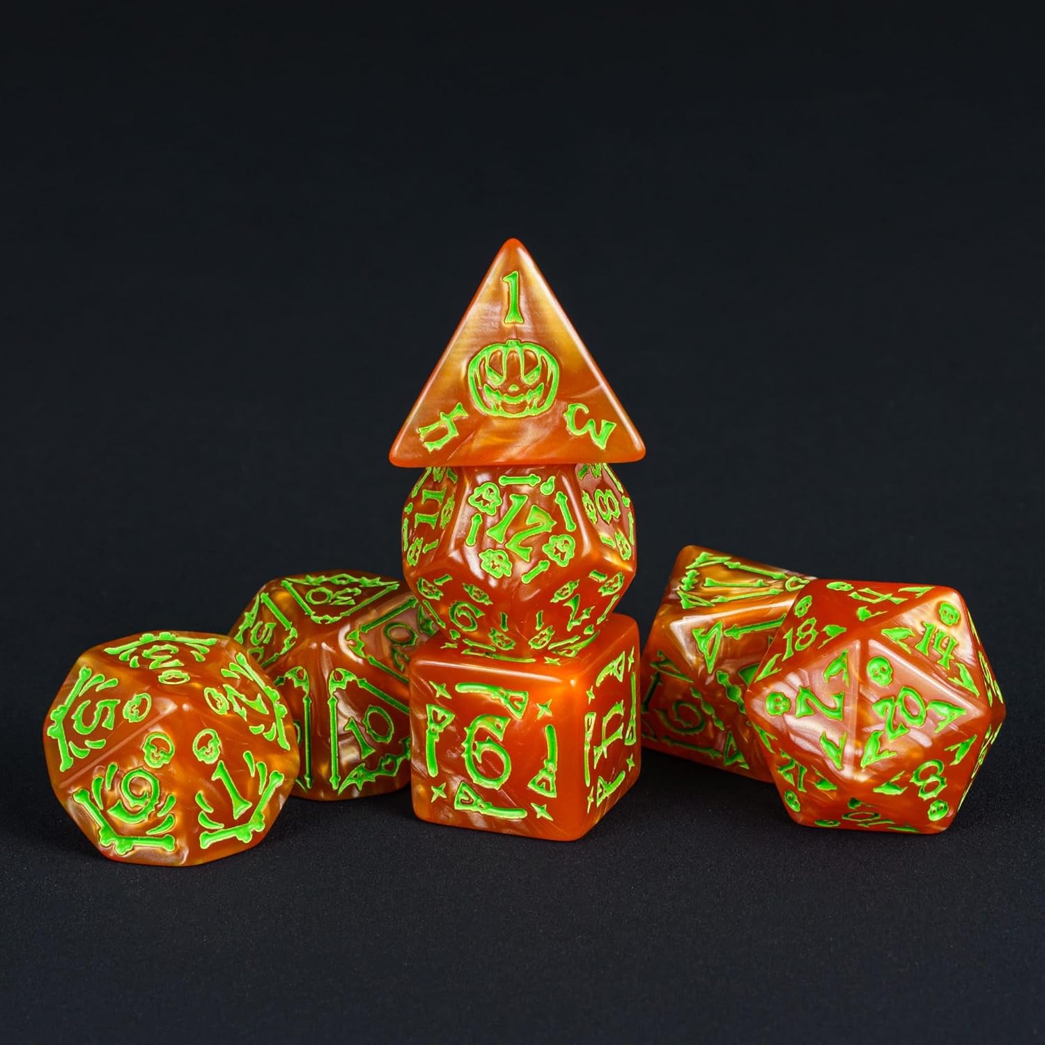 7-Die DND Dice Set Halloween Pattern Polyhedral Die Set with Leather Bag, Skull Dice D&D Die for RPG Table Games(Halloween Pattern-Orange/Green Number)