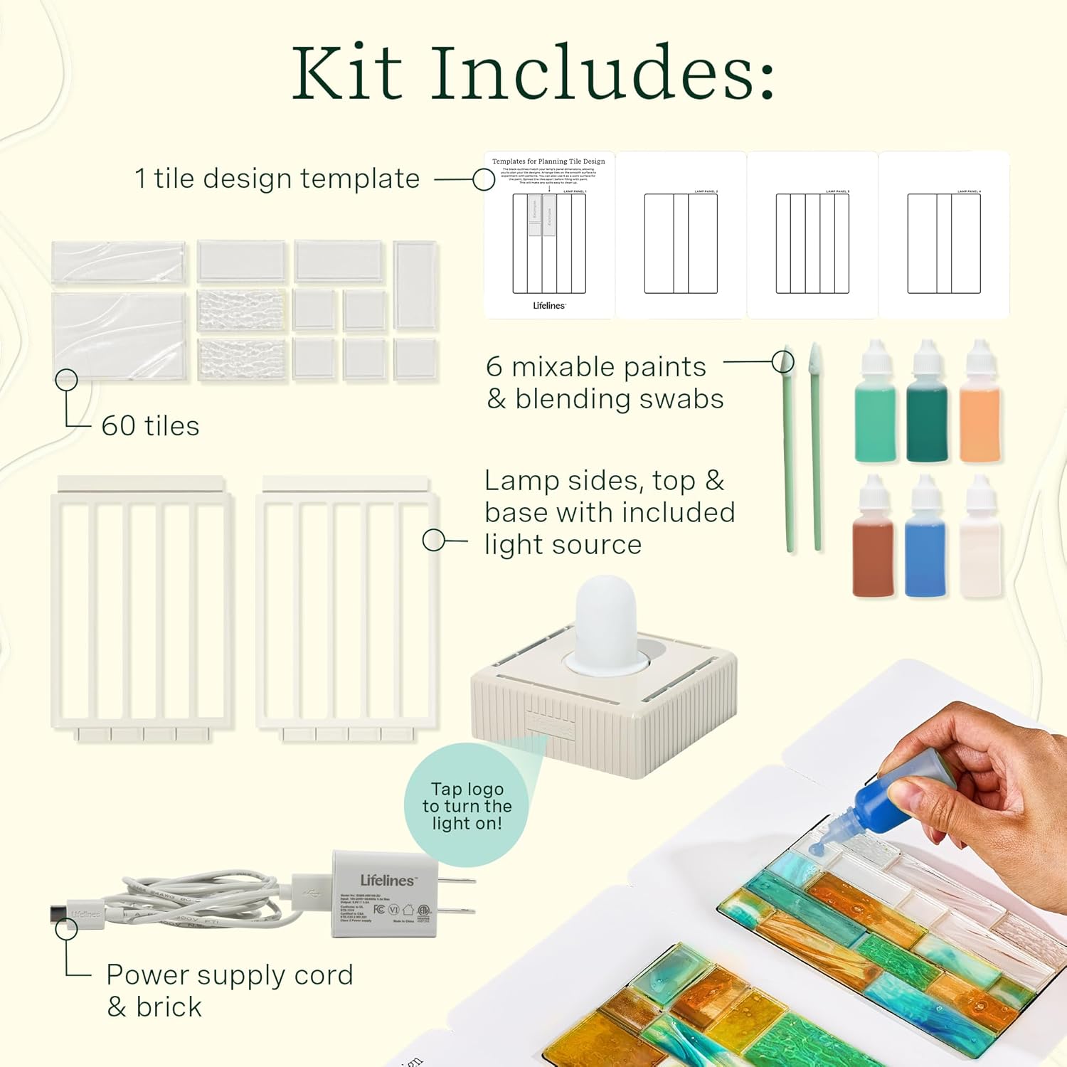 - Kit Includes: Everything you need to create a gorgeous customized tile lamp. Includes 60 tiles, 1 tile design template, 6 mixable paints & blending swabs, lamp sides, top & base with included light source, power supply cord & brick.