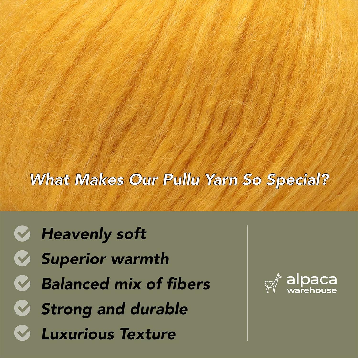 - Baby Alpaca and Merino Wool blend: Sourced directly from a manufacturer in Peru, each skein of yarn is custom-made for Alpaca Warehouse! As a result, we’re able to offer a premium wool that’s beautifully unique, surprisingly strong, and even hypoallergenic. Our yarn composition is 70% Baby Alpaca, 7% Merino Wool (21.5 mic.), 23% Polyamide.