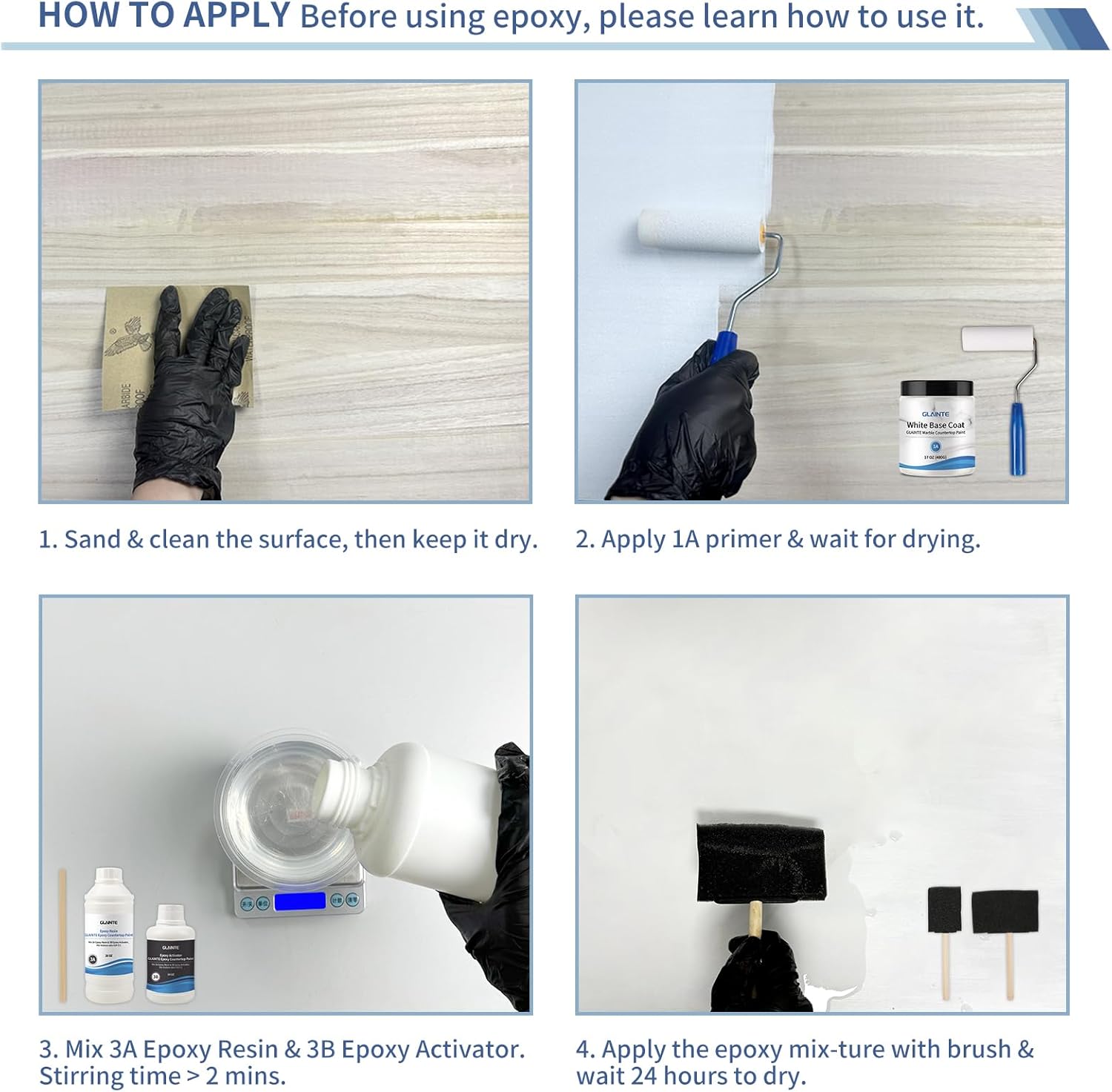 - SAFE & SUSTAINABLE: GLAINTE marble countertop paints are formulated with high-quality water-based paint that is low-odor, non-toxic, and water-based. Suitable for flat and smooth surfaces such as wood, tiles, etc. Achieve the luxurious look of marble in just one weekend. NOTE: If bubbles appear when applying epoxy, use a black sponge brush to reapply, or use a sharp tool to pierce them. DIY production can not be perfect; please understand