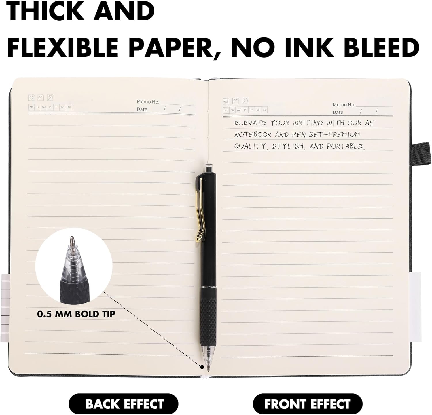- Quality leather & paper: our A5 notebooks are made of 100 gsm thick paper, providing a smooth touch and resisting ghosting and bleeding, compatible with most pens, pencils and markers; the lined journal notebook with pens feature premium PU leather hardcover, waterproof and easy to clean, helping the notebooks stay upright without the pages curling or bending; the ballpoint pen is designed with a 0.5 mm bold tip for smooth, non-leaking drawing, ideal for use with the journal
