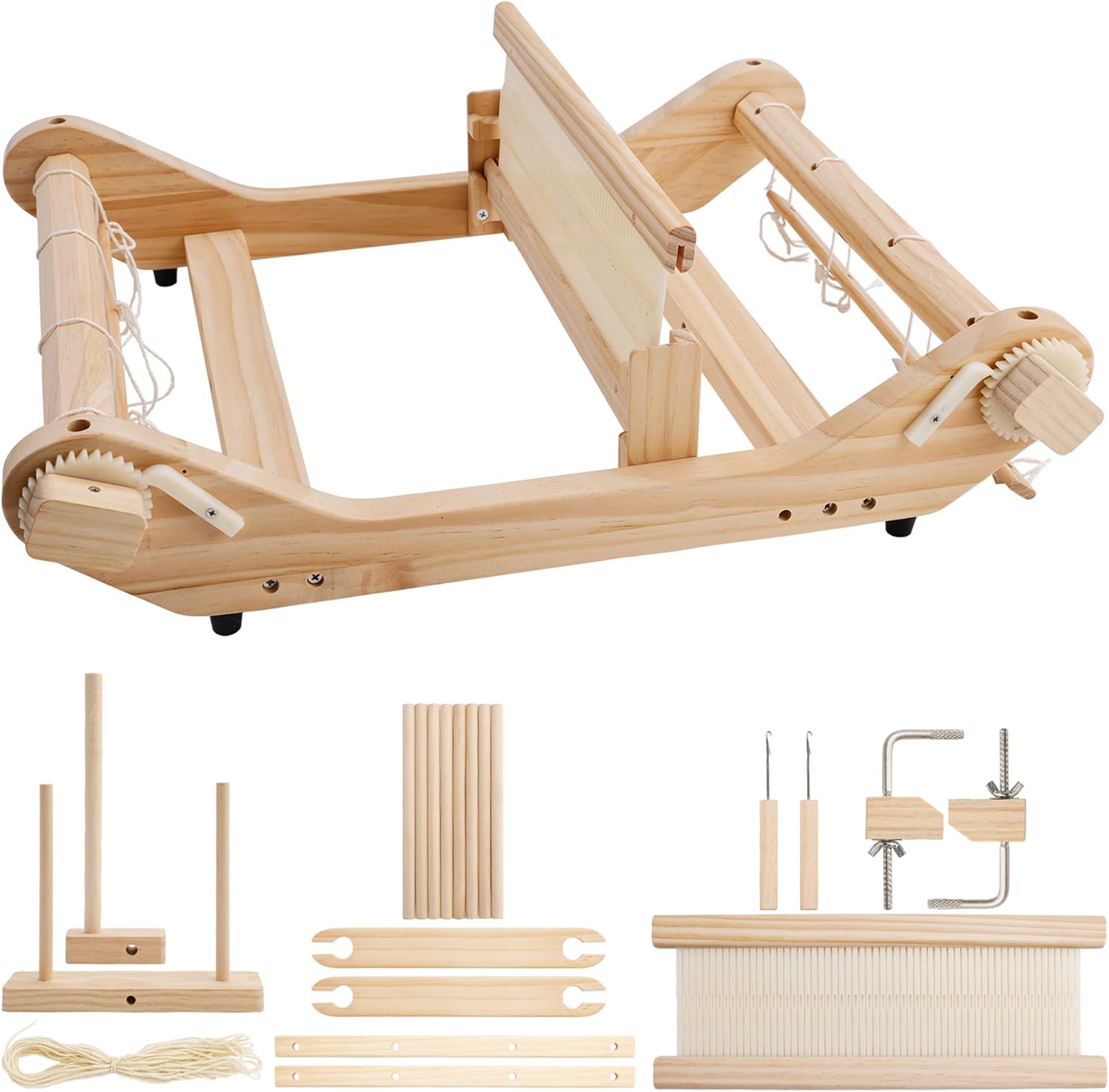 - 【Package Include】Includes 1 loom frame, 8 strings, 2 sticks, 1 heddle shed sticks, 1 shuttle, 2 heddle hooks, 2 clamps, 1 peg, 1 yarn stand, 1 sandpaper, and 8 warp sticks. Please note, yarns displayed in images are not part of the package.