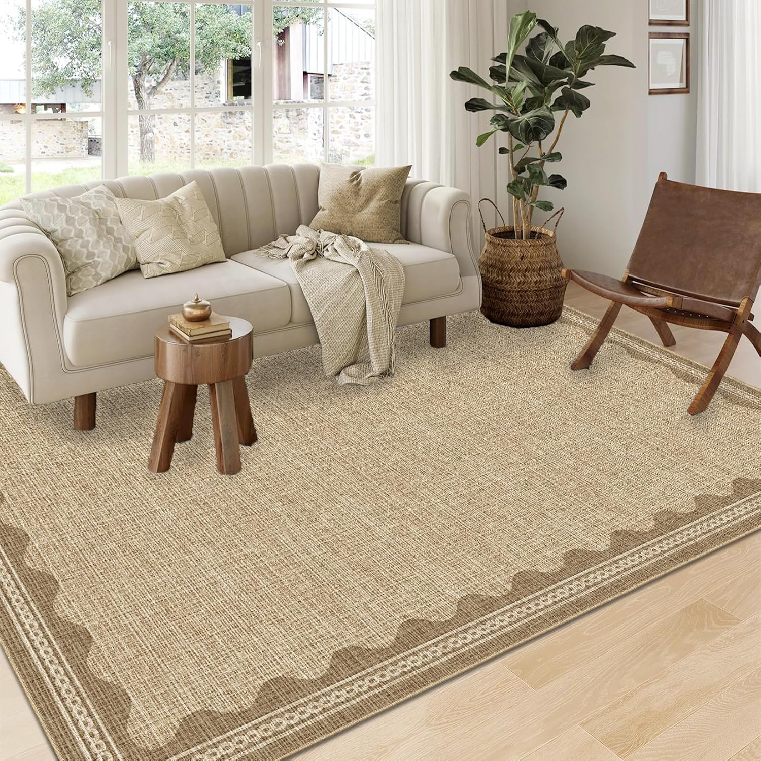 Scalloped Washable Rug 10x13 Area Rugs for Living Room, Solid Tan Rug for Bedroom Girls, Non Slip Throw Carpet with Rubber Back, Soft Dorm Nursery 10x13 Scalloped Rugs for Dining Room