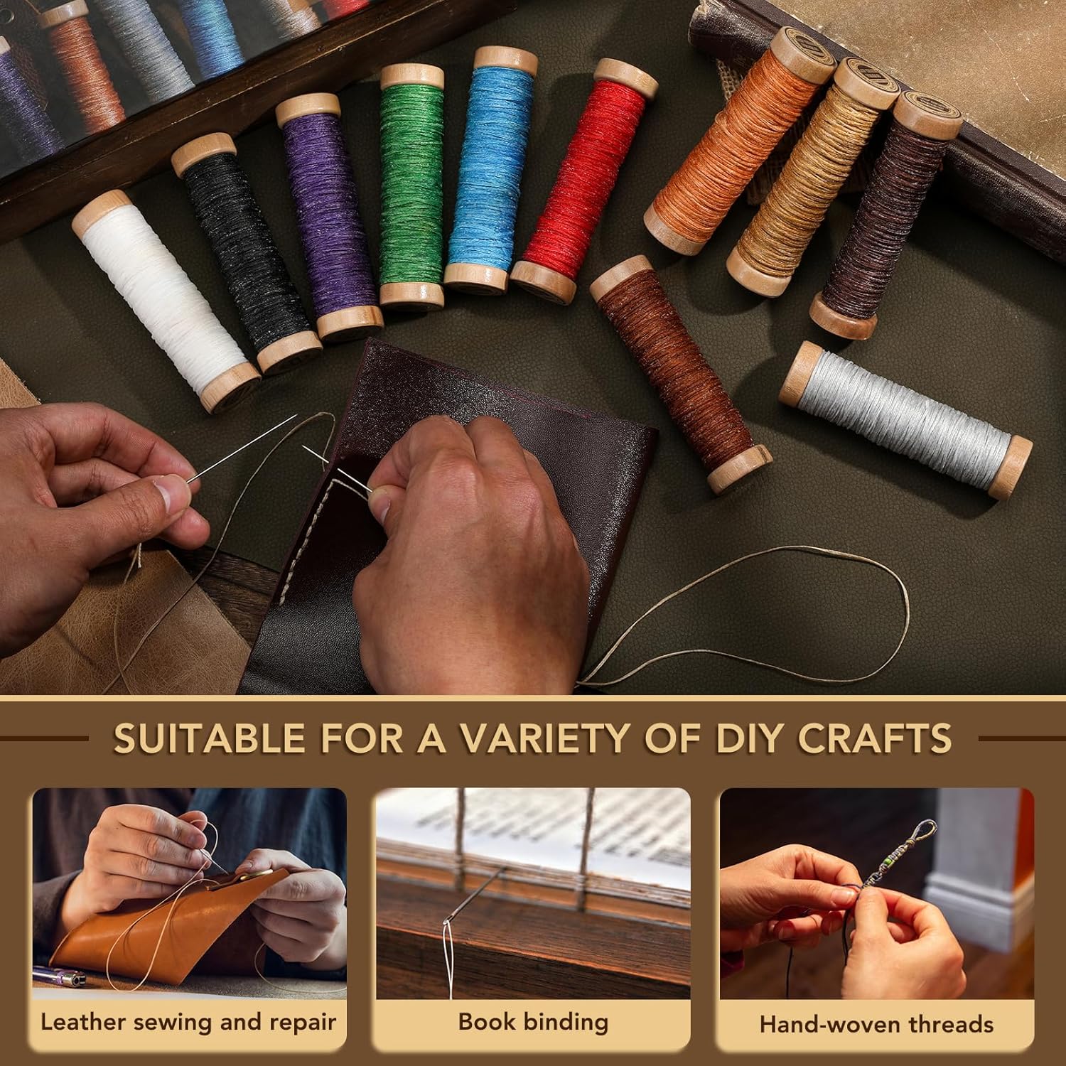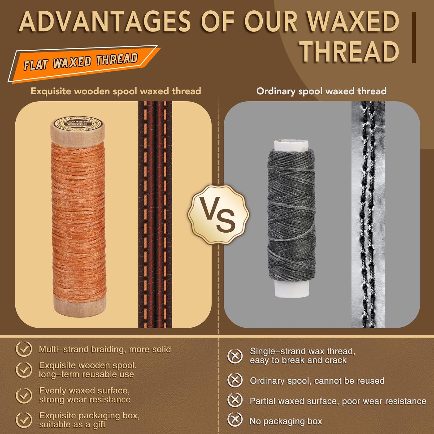 - Strong and Durable: The waxed thread is evenly waxed and is designed with an exquisite wooden spool, and the spool is reusable. The heavy duty thread has high tensile strength and wear resistance, not easy to break. The flat waxed thread also has good waterproof and moisture-proof properties and can be used for a long time