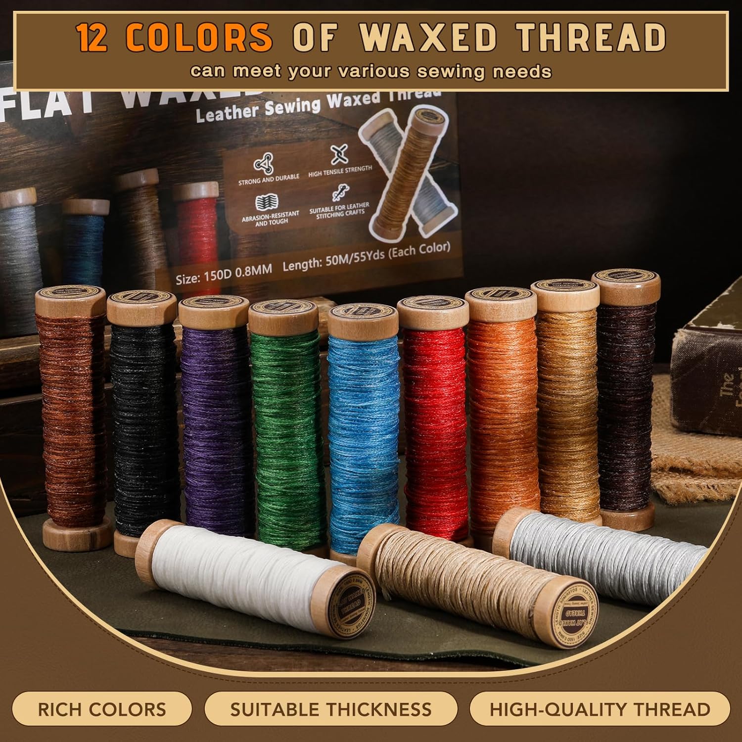 - Leather Sewing Thread: The flat waxed thread is made from polyester, has a 0.8mm diameter, and is 50 meters/55 yards for each spool. The lightly waxed and multi-strand woven waxed thread is strong and wear-resistant, which can meet your needs in leather sewing