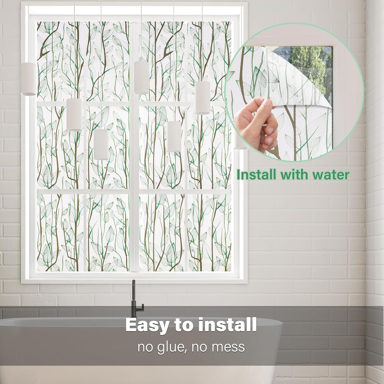 Donox Frosted Glass Window Film Heat Control UV Blocking, Static Cling Reusable Home Bathroom Door Window Privacy Film, Green Leaf Pattern Window Covering with Installation Tool, 17.5 in x 13.1 feet