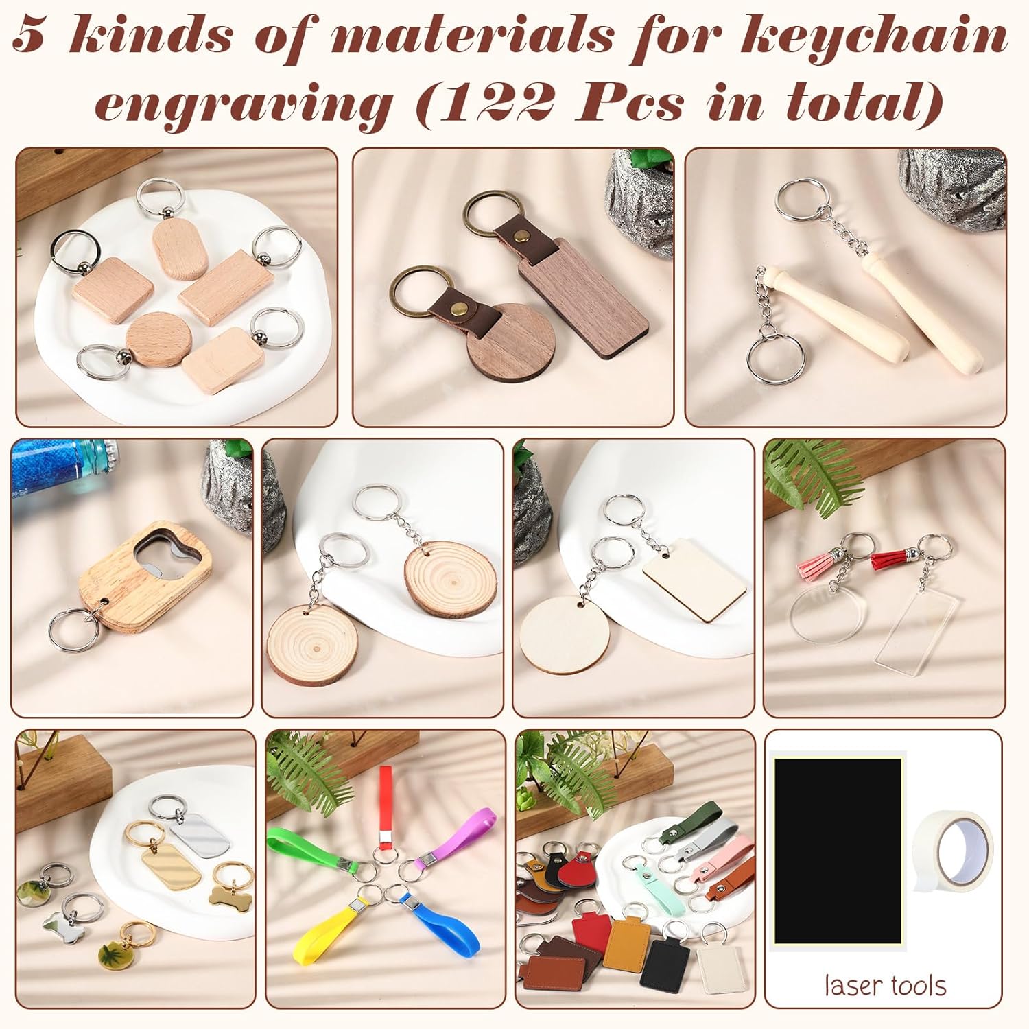 - 122 Pieces Keychain Engraving Material Kit: this kit contains many laser keychain blanks and auxiliary tools; The keychains are made of 5 different materials, including acrylic, stainless steel, wood, PU leather, and silicone to meet your various needs