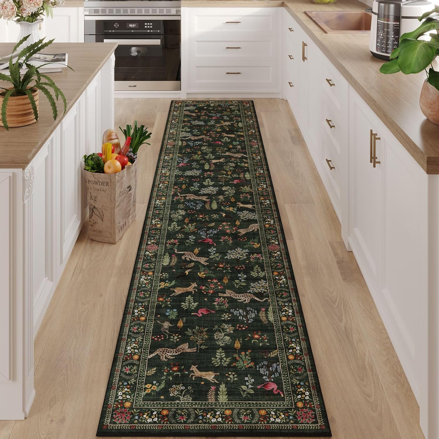 Rugcomf Runners for Kitchen Rug Non Slip 2'x10' Long Washable Rugs with Rubber Backing Soft Floral Animal Carpet Runner for Kitchen, Laundry, Bedroom, Bathroom (Green)