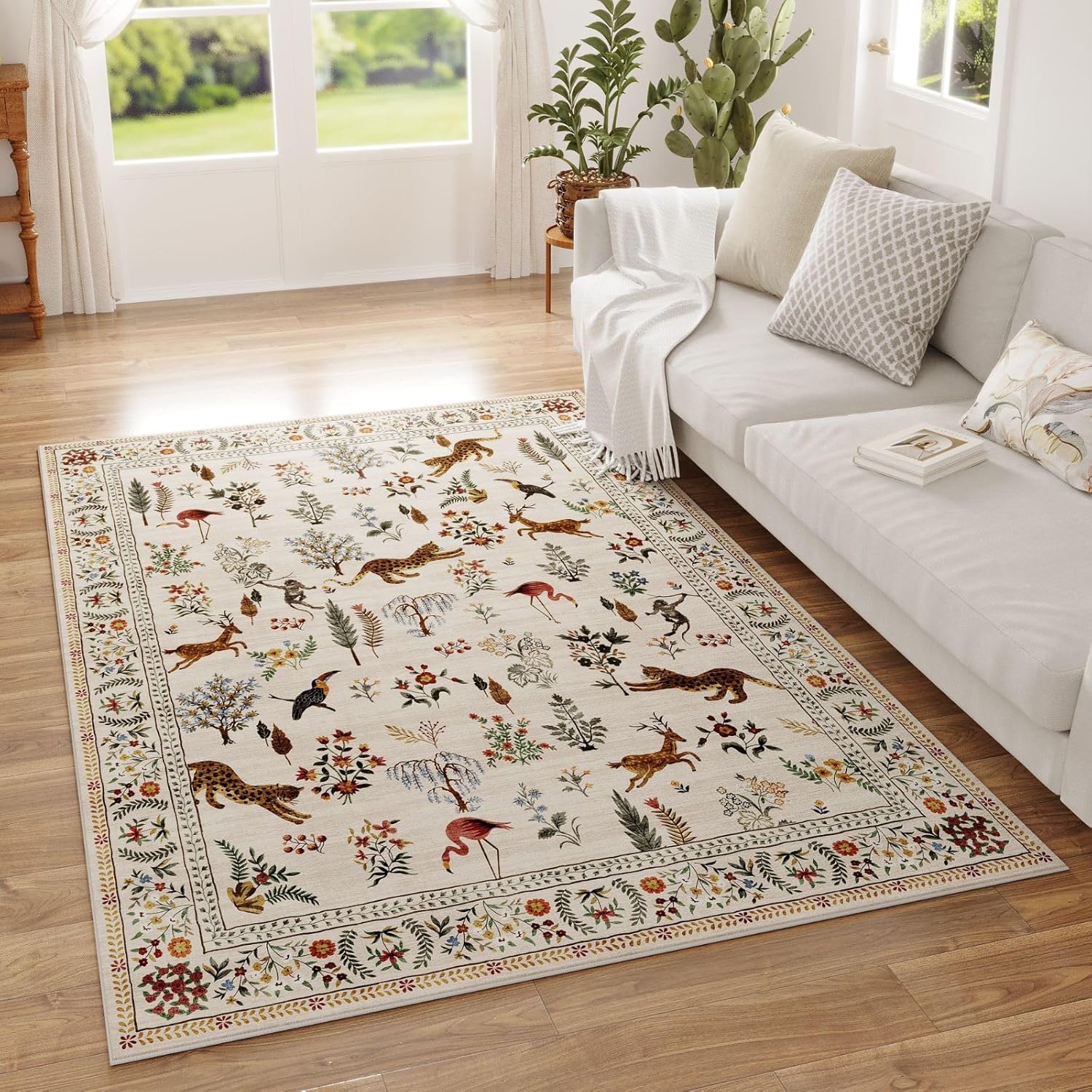 Rugcomf Area Rug 4x6 Rug Washable Boho Rugs Non Slip Low Pile Floral Animal Small Carpet for Bedroom, Bedside, Kids Room, Office, Dining Room (Beige)