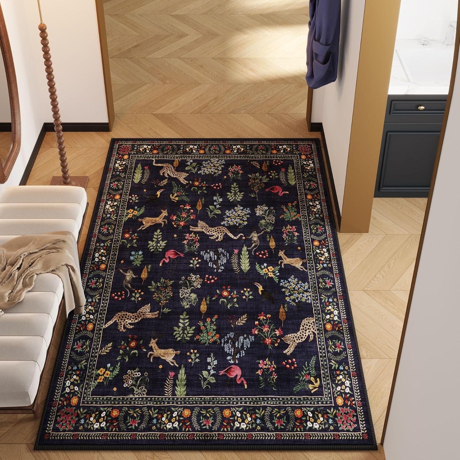 - Intriguing Animal and Floral Design—This floral animal rug woven by machine, The Vibrant-inspired design is digitally printed which details can’t be replicated by hand. Vibrant floral carpet patterns Intriguing adorn the spaces in your home, including the living room, bedroom, dining room, entryway, children's playroom, home office, kitchen, and more.