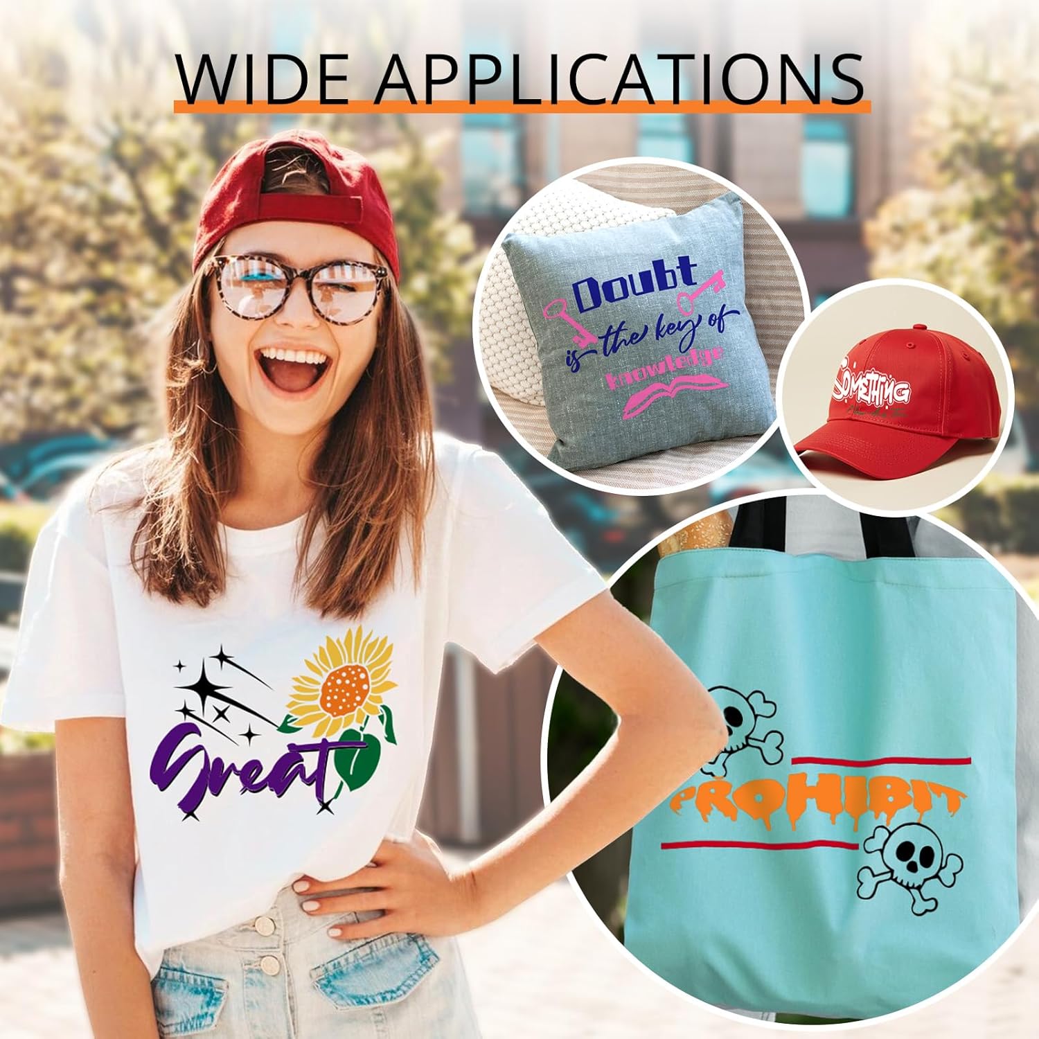 - 【Versatile and User-Friendly】HTV Heat Transfer Vinyl is soft and easy to transfer with a heat press or iron. It can be layered for multi-color designs, making it perfect for both beginners and professionals to create intricate, vibrant designs. Ideal for bright, durable designs on T-shirts, bags, casual wear, pillows, hats, and more.