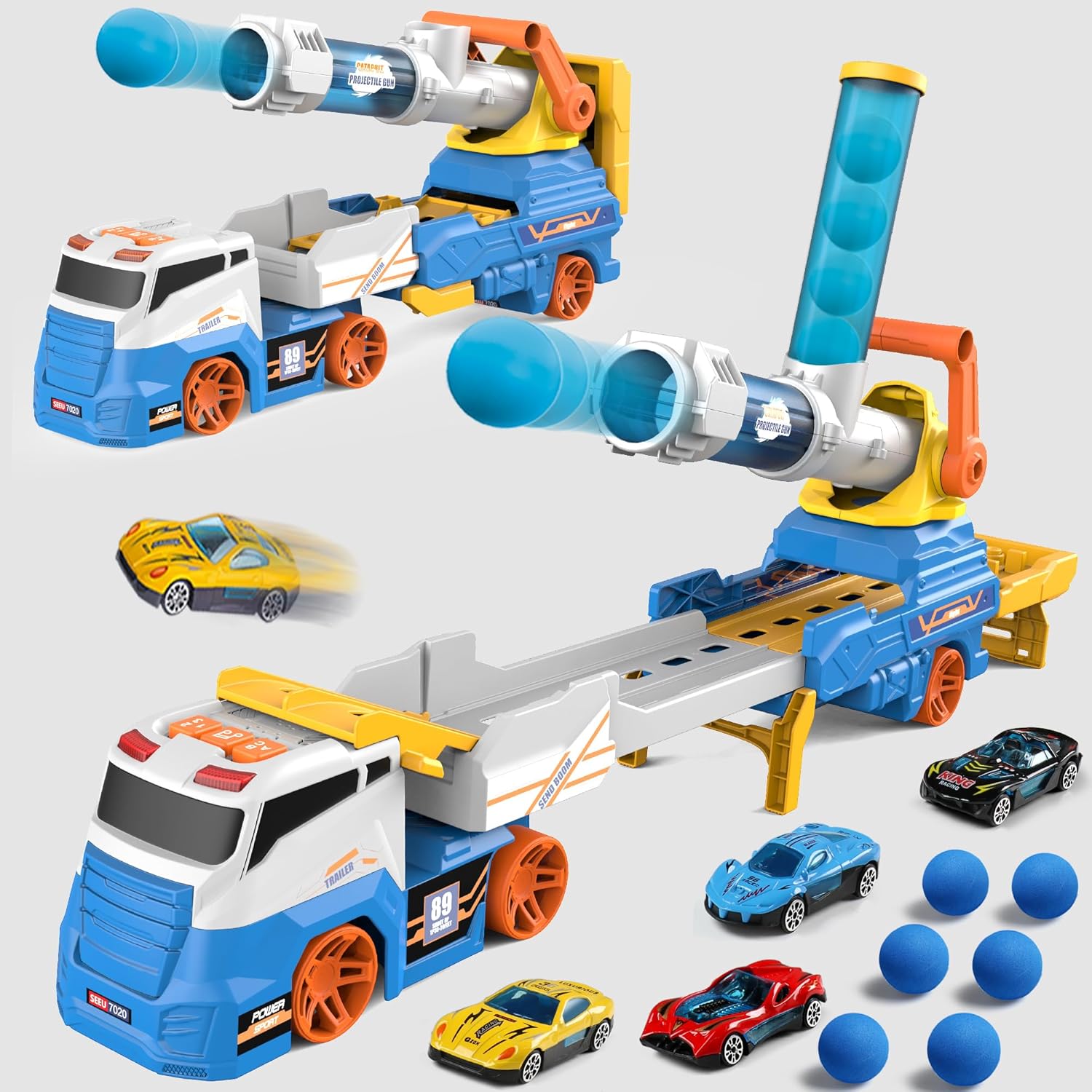 - 【Multiple Play Ways Kids Car Toys】: Kids will have a blast while blasting off with this fantastically fun car toy rocket launcher. Includes 4 racing cars,6 Ball, 1 big Launchers car. The Ejection cars can spread to 28" large turck! Your lovely kids can launch and race simultaneously!