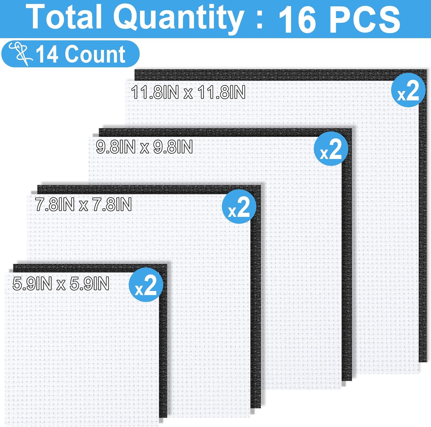 - 【4 Sizes】Package Includes 4 sizes, 5.9 x 5.9 inch, 7.8 x 7.8 inch, 9.8 x 9.8 inch, 11.8 x 11.8 inch. Each size has 4 pieces (2 White and 2 Black) for a total of 16 pieces. Multiple sizes and sufficient quantities to meet your need. 14 count aida cloth has clear grid layout and a strong 3D touch feeling. You can cut cross stitch cloth freely by your need