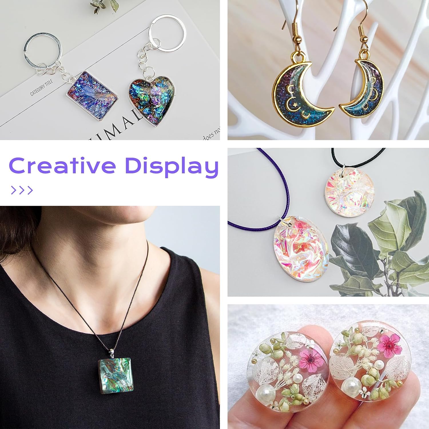 - Great Resin Jewelry Making Supplies: includes high - capacity clear uv epoxy resin 300g, professional UV lamp, silicone mat, earring molds, 12 colors glitter, 12 colors glitter flakes, 12 kinds of dried pressed flowers, multi-shape silicone mold, multi-shape bezel pendants,planet stickers, necklace chains, key rings, earring hooks, jump rings, epoxy resin tape, tweezers, small silicone cup, stirring stick, silicone spoon, instruction manual, etc.