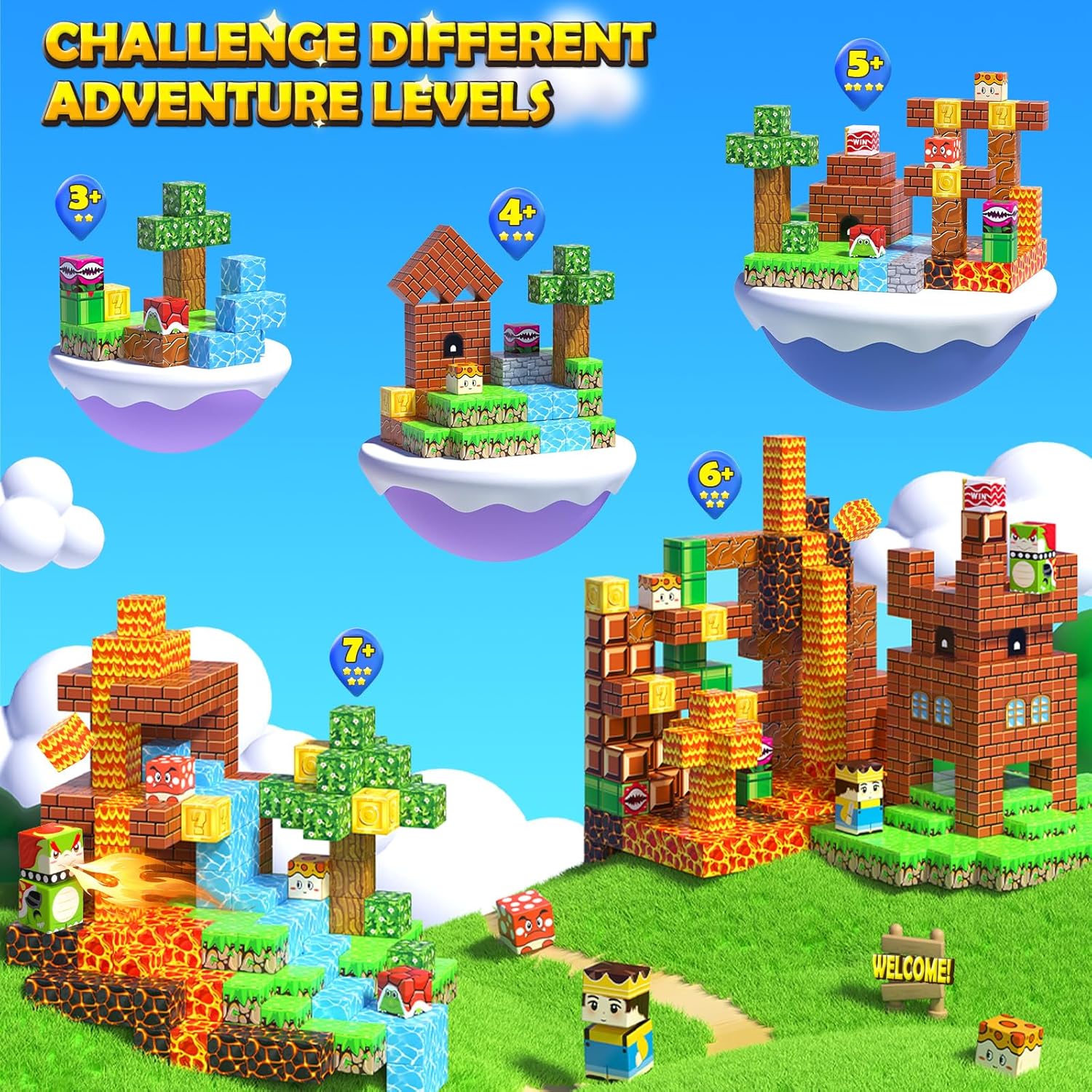 - 【100PCS MAGNETIC BLOCKS CUBES】Designed for kids who love creative building and adventure, feature multiple elements like grass, coin blocks, rock blocks, water blocks, and lava, kids can construct their dynamic game levels that bring the popular video game to life making it a great gift for boys and girls