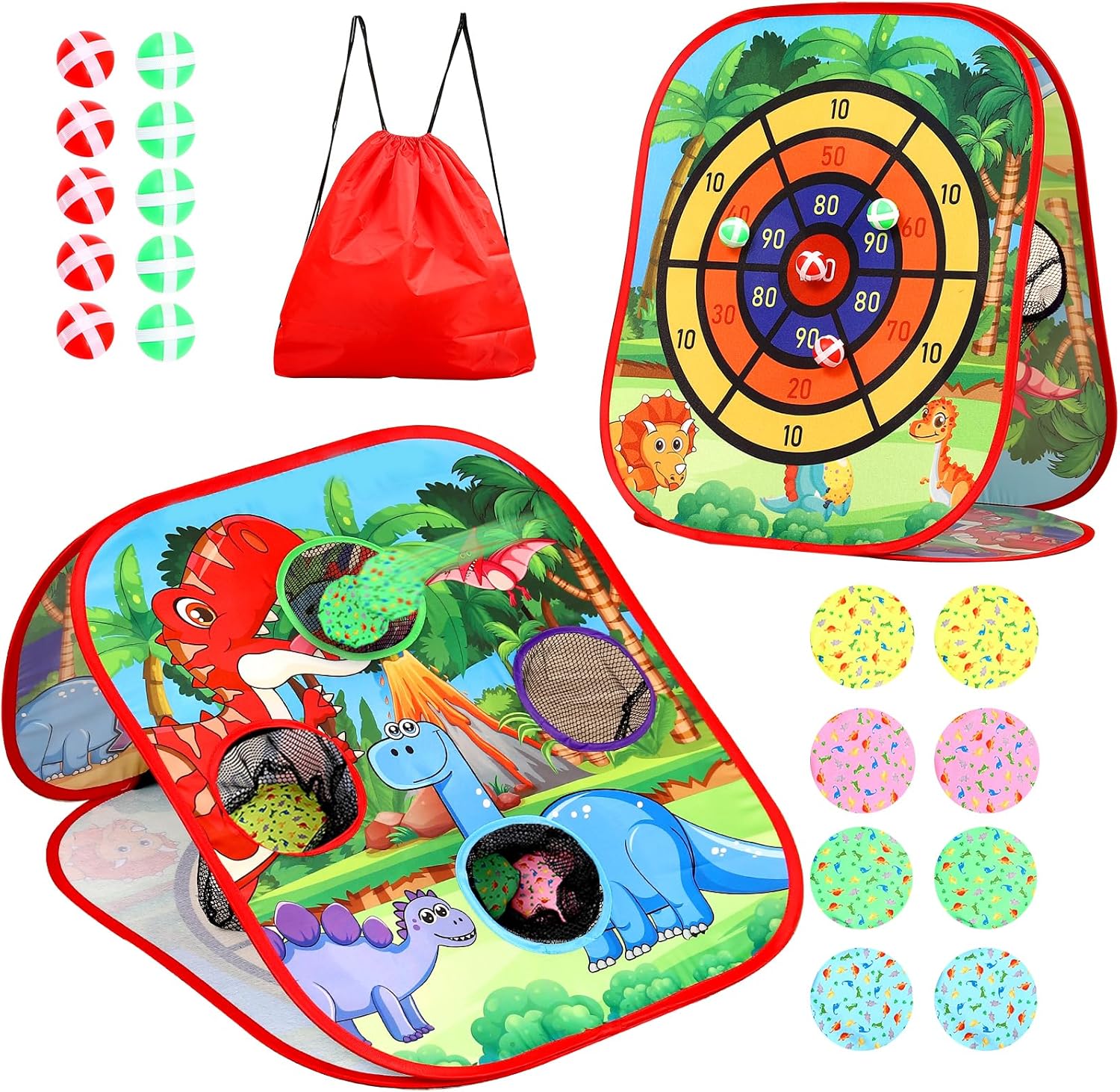 - 2 in 1 Bean Bag Toss Game:The set includes 1 throwing board, 8 bean bags printed with dinosaurs, 10 balls, and 1 storage bag (backable). The hole board and dart board are combined together, and can be switched back and forth on both sides to enjoy different game modes.