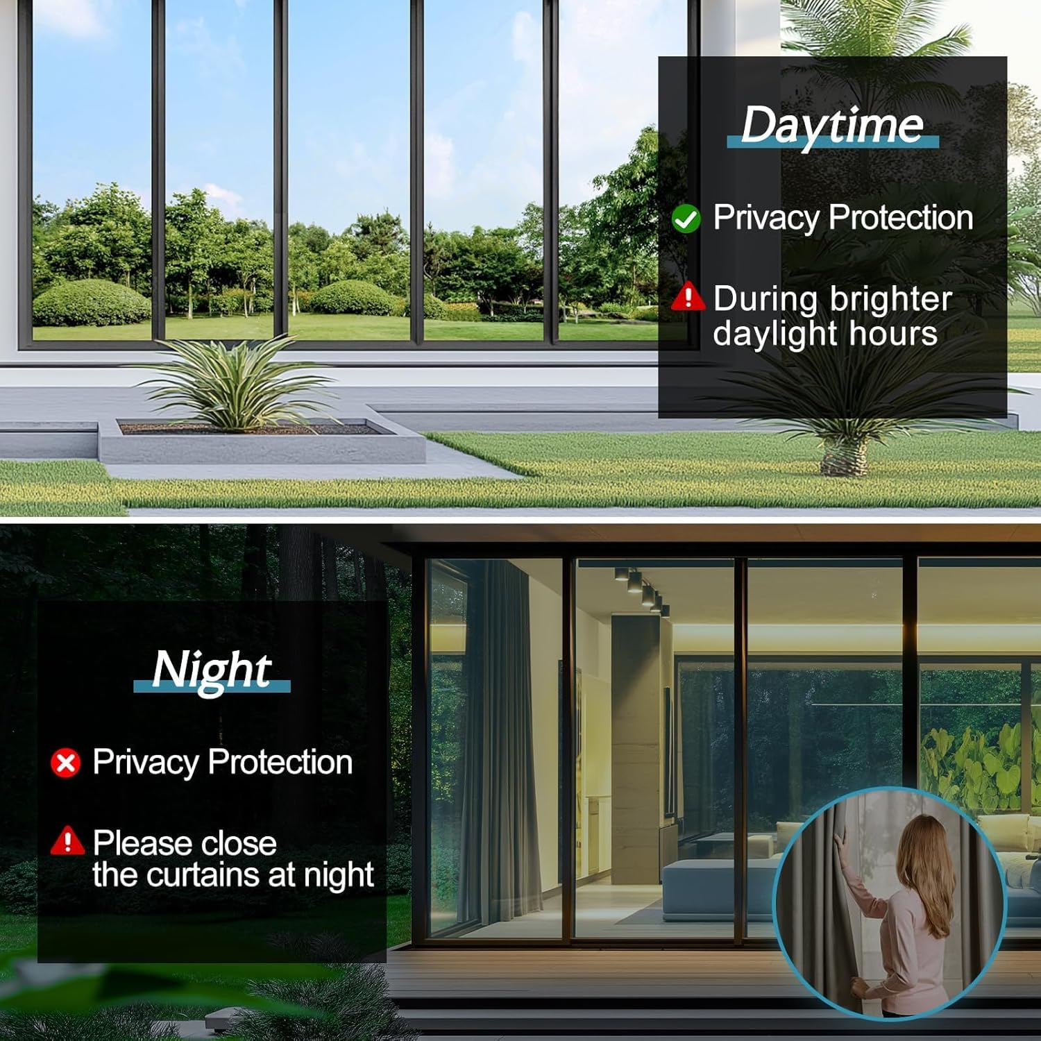 - Mirror-like Effect, Daytime Privacy: Achieve daytime privacy while maintaining natural light with reflective window film. During daylight hours, it creates a mirror effect, blocking outside views while allowing clear visibility from inside. At night, the effect reverses, so remember to draw the curtains for privacy