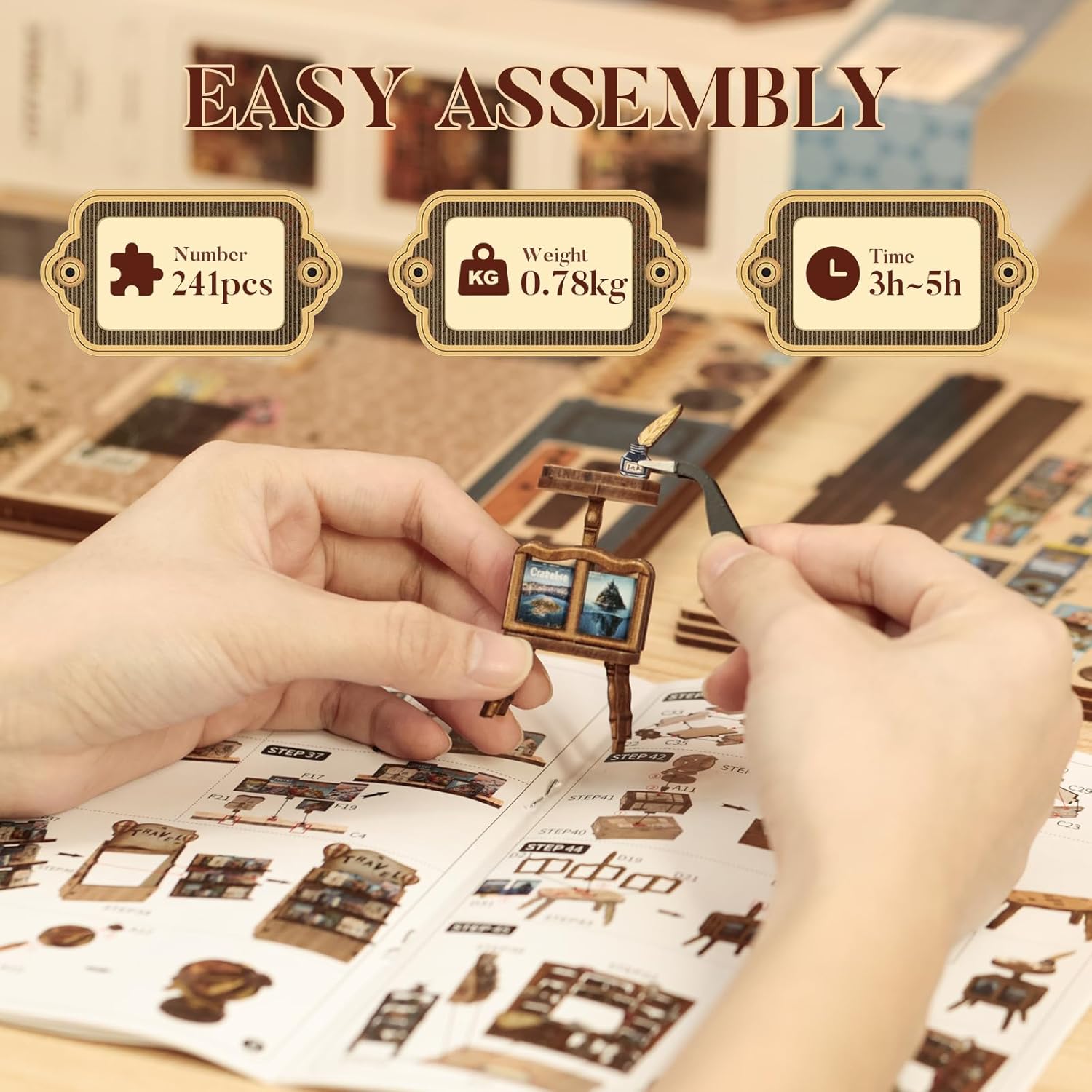 - 【 Unique Designed Book Nook Kit - Journey Trace Bookshop】The booknook is DIY miniature diorama made from wood, it is high quality and durable. The pieces are laser-cut and pre-colored. There is also a step by step instruction for craft hobbyists to follow it