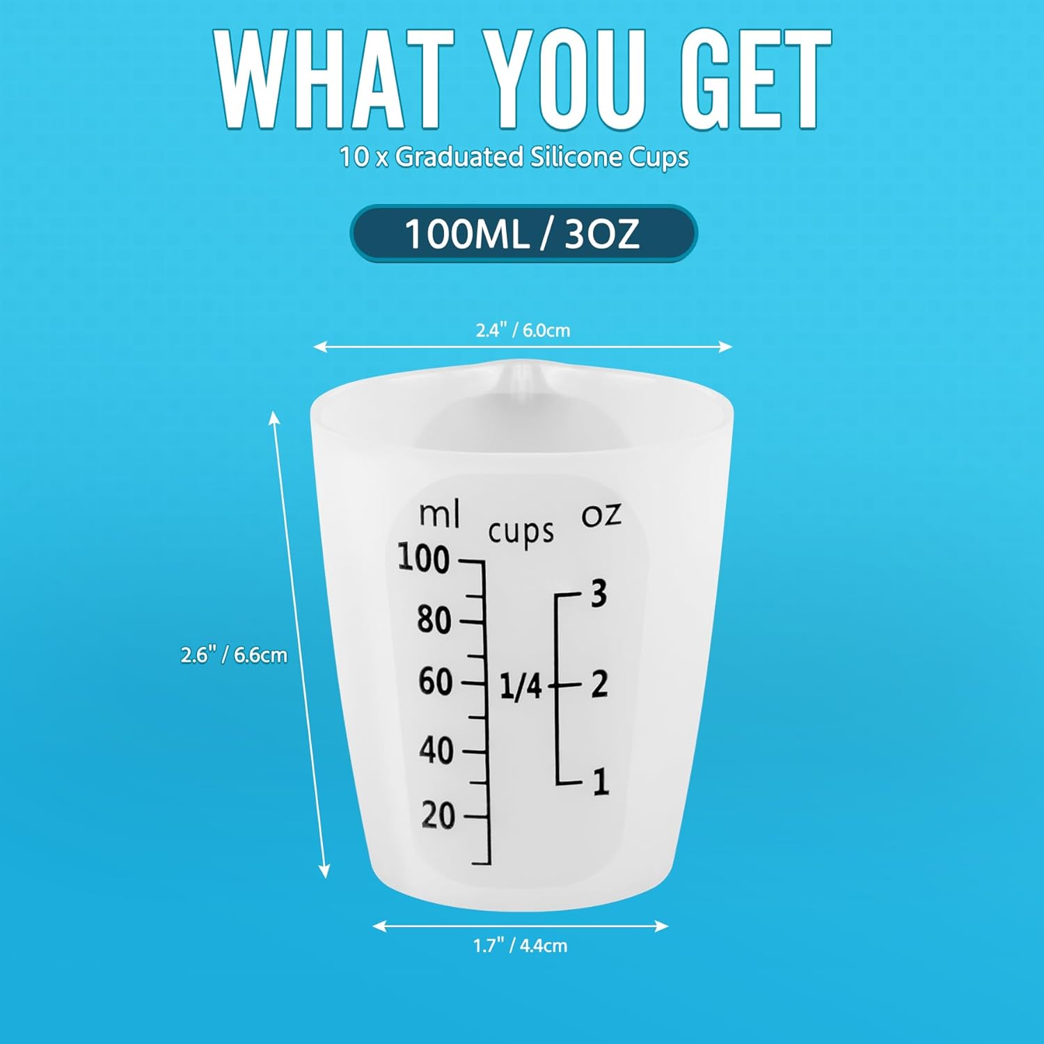 - 【SWIGRANCE Resin Mixing Cups Set】 Set of 10 silicone measuring cups with 100ml capacity each, featuring clearly visible black measurements 20~100ml / 1~3oz, convenient to read when mixing resins or even other colored liquids.
