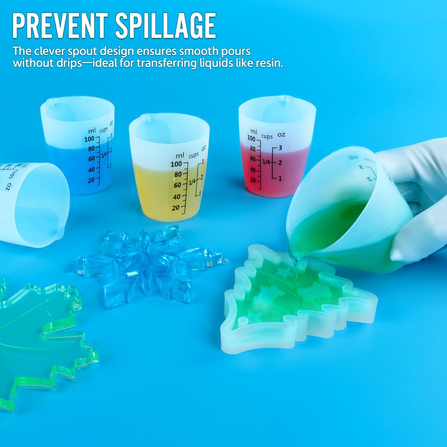 - 【Prevent Spillage】 The tip design spout make the pouring easier and more accurate, prevents liquid spills and soiling of table tops. Also comes with mini silicone cups, approximately 15ml capacity, suitable for small amount liquid, resin, pigment mixing, reduce waste.