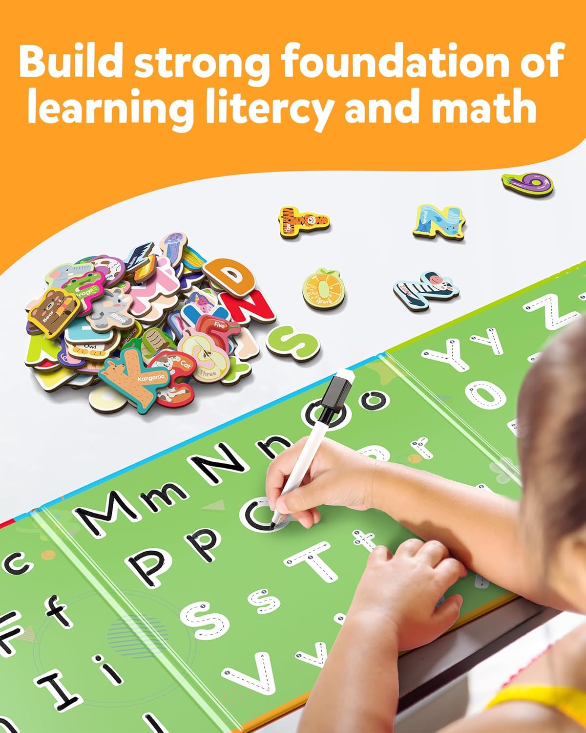 - Magnetic Letter & Number Matching Book: This alphabet number puzzle book contains 26 animal letters, 10 fruit numbers, 26 uppercases, 52 lowercases, 26 flashcards, 10 numbers, 3 math symbols and 2 markers. By matching the letters and numbers to the board, kids can learn alphabet and numbers easily and quickly in a fun way.