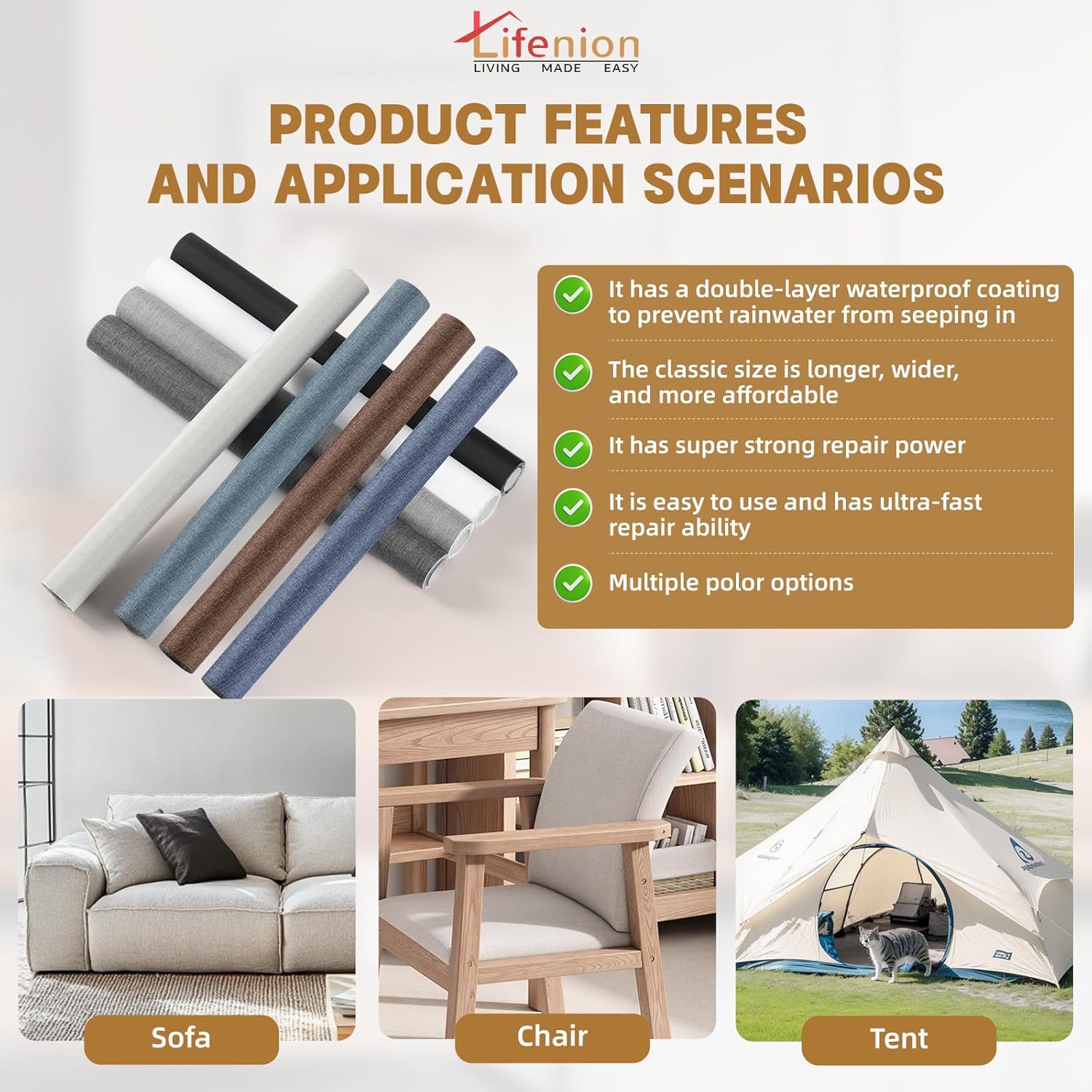 - WIDELY USED: Fabric repair patches are suitable for Sofas, Furniture, Car Seats, Chairs, Tote bags, etc, without the need for patches and are easy to use. They require no heating, ironing, tools, or sewing to buy new furniture or outdoor equipment. Lightweight packaging, easy to carry and store.