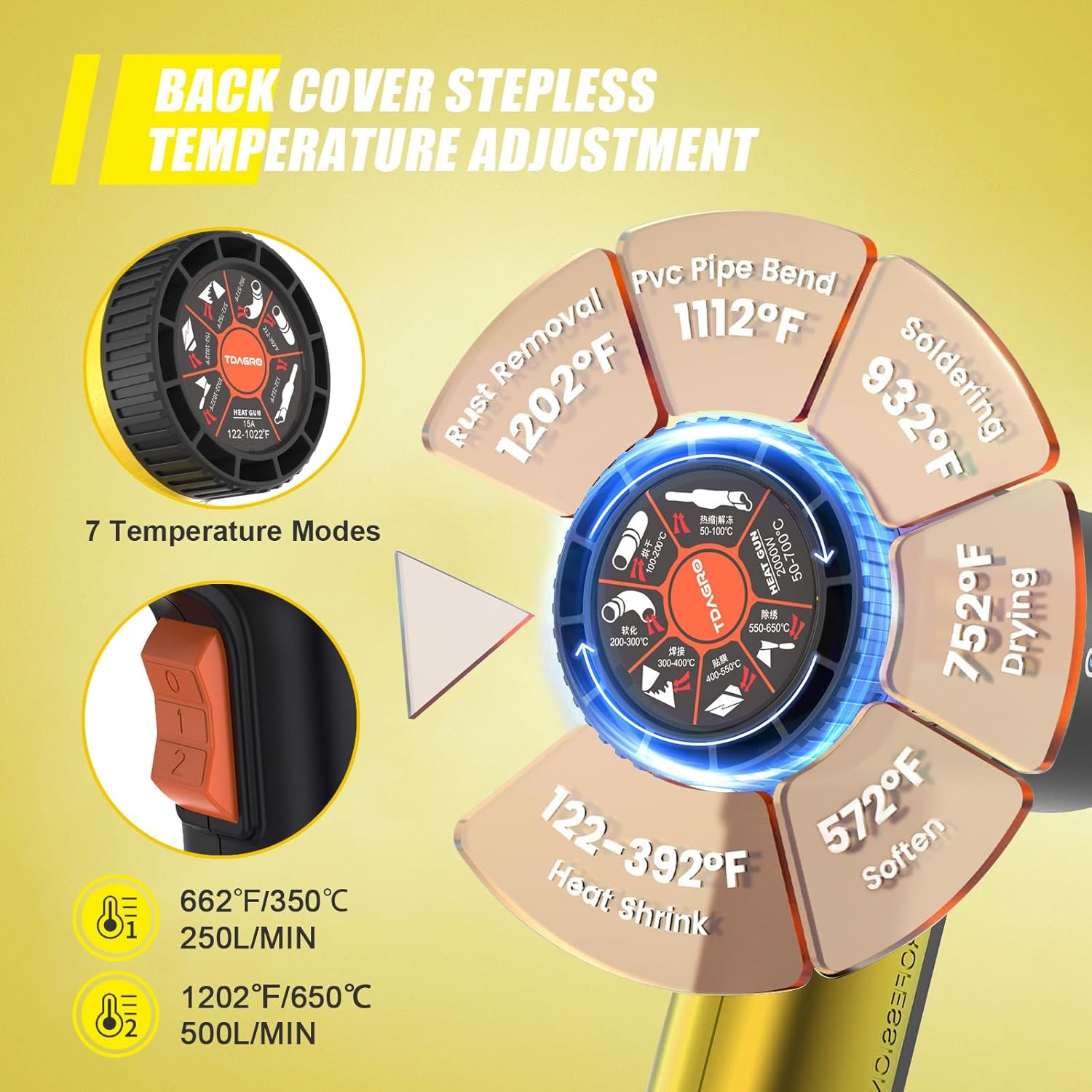 - ✅【Variable Temp Control & 2 Modes】Upgraded heating gun with 7 variable temperature settings and 2 fan settings, allowing users to adjust the temperature from as low as 122℉ to as high as 1202℉, for convenience to deal with their works rightly.