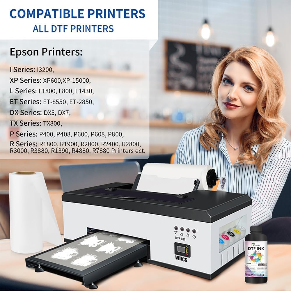 - DIY YOUR IDEAS WITH HIGH EFFICENCY. Low ink consumption takes high speed printing with stable quality; 3 Level refinery DTF ink improve the printer efficiency; smoothly prints up to 358 feet. Make Your Own Unique Gifts for your family or friends on Christmas, Thanksgiving Day, Valentine's Day, Halloween etc.
