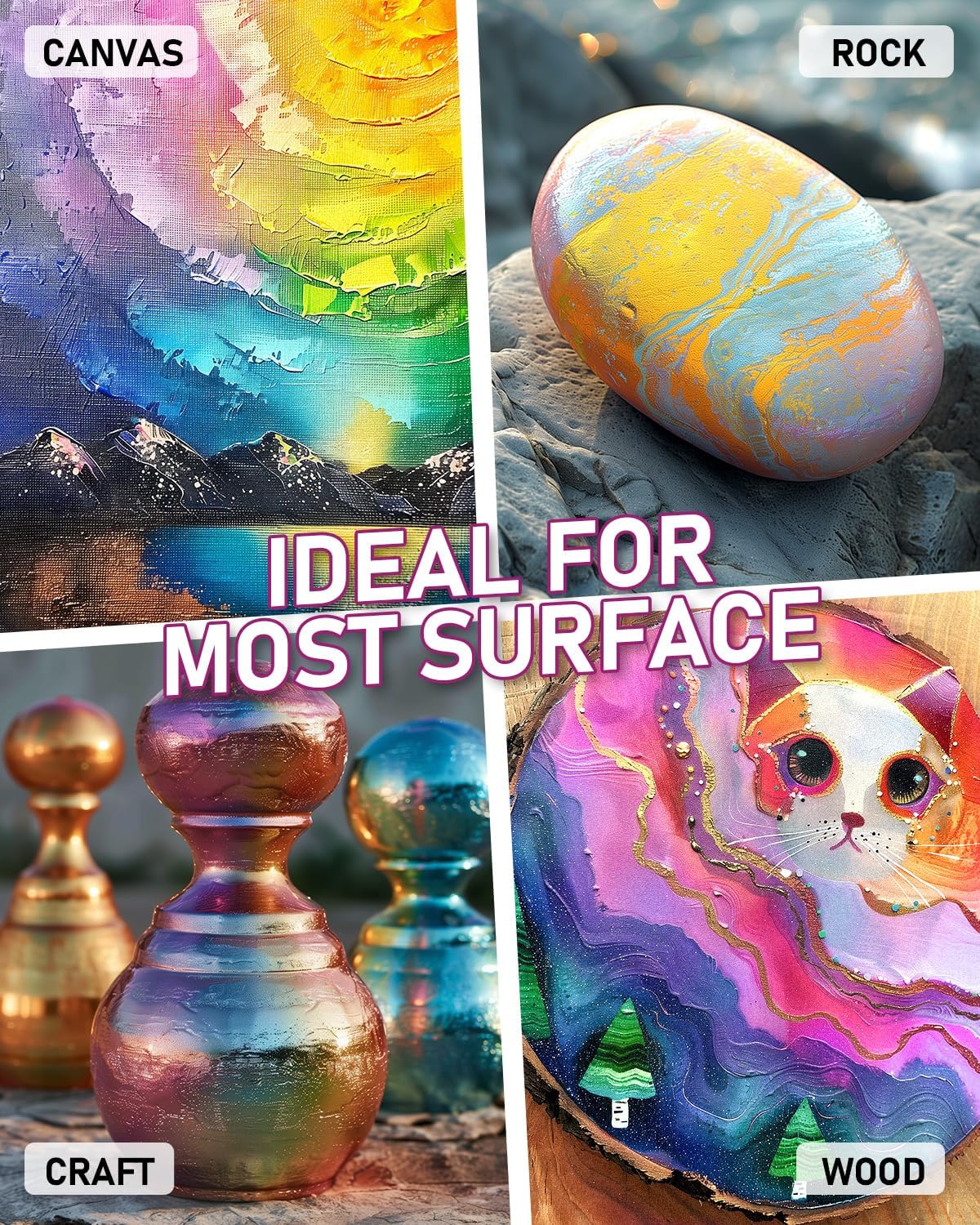 - Versatile Application - This metallic acrylic paint applies well on most surfaces like canvas, fabric, rock, wood, glass, ceramic, adding a luminescent neon effect and a stunning finish on your art projects. Join us and free your imagination