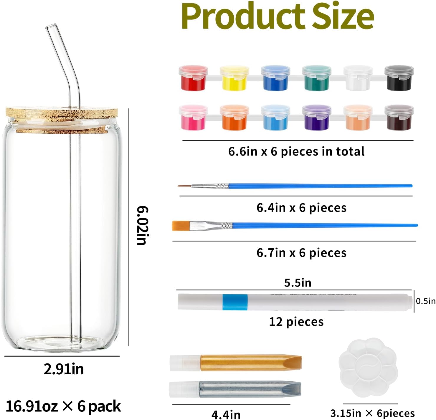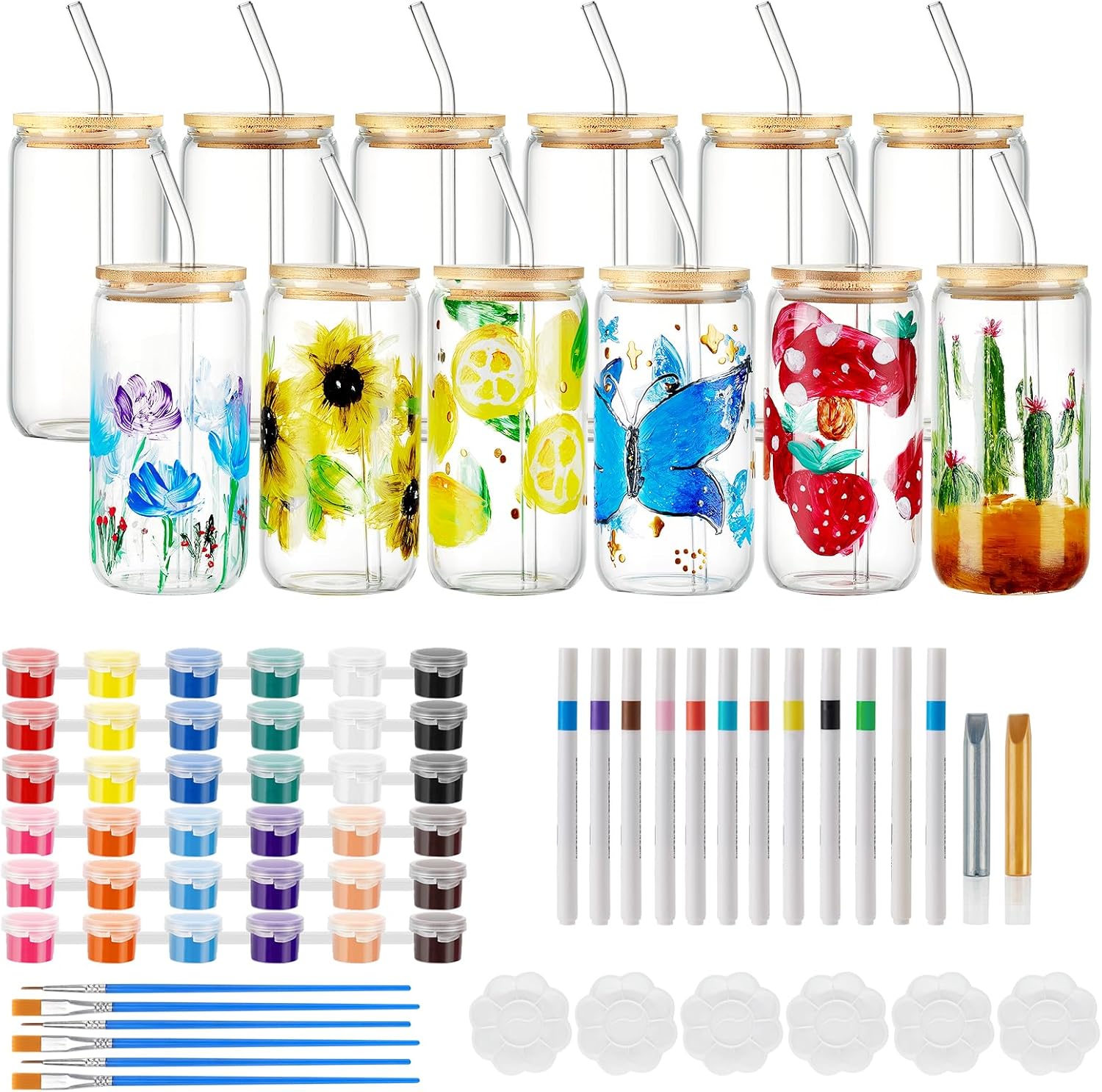 - Included Components : 12 markers, 36 acrylic paints, 2 glass paint outline pens, 12 brushes, 6 palettes, 6 wine glasses