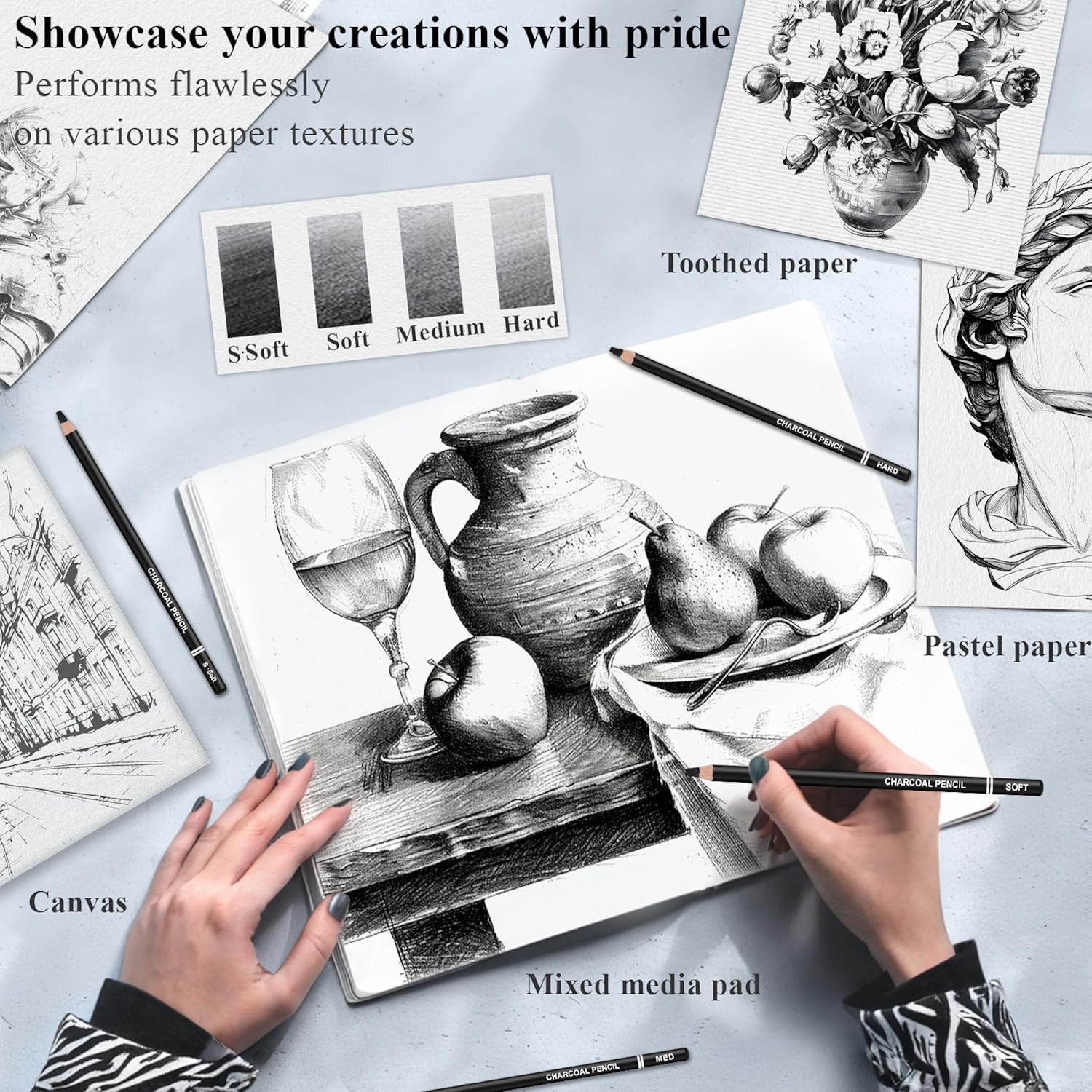 - Versatile Art Tools: This charcoal pencil set is a versatile choice for designers, illustrators, and artists who want to achieve their best work on paper or in sketchbooks. Whether you're focusing on general charcoal techniques for figure drawing, portraits, or still life compositions, these pencils provide the flexibility needed for both classroom and personal use.