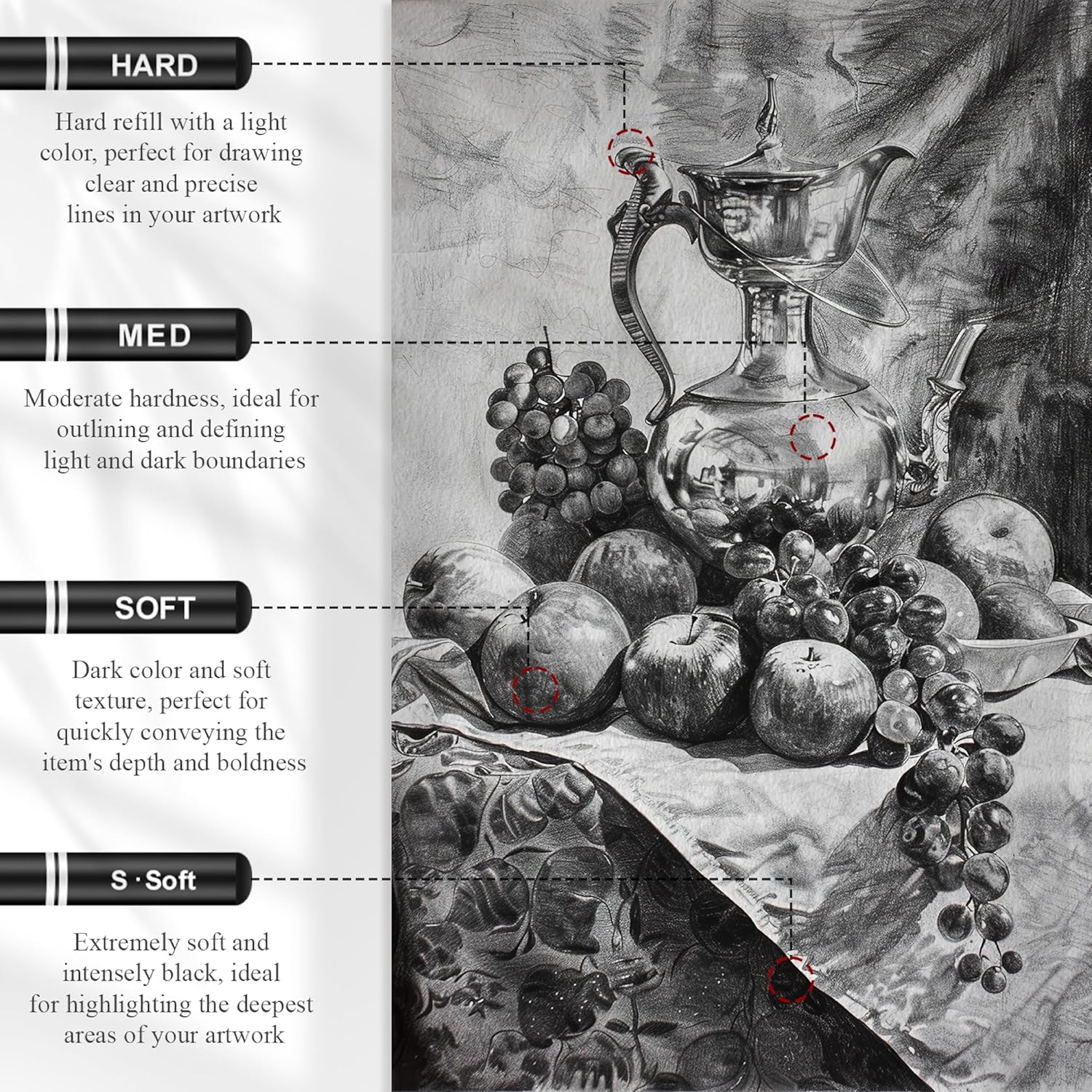 - Complete Charcoal Pencil Set: Aenir charcoal pencil set includes 12 charcoal pencils designed for artists who seek precision and quality. Available in four grades—S-Soft (3 pcs), Soft (3 pcs), Medium (3 pcs), and Hard (3 pcs)—these charcoal art supplies are suitable for a variety of artistic techniques. Whether you're working on intricate charcoal drawing pencils or broad sketches, these soft charcoal pencils are excellent for detailing, sketching, drawing, shading, and blending.