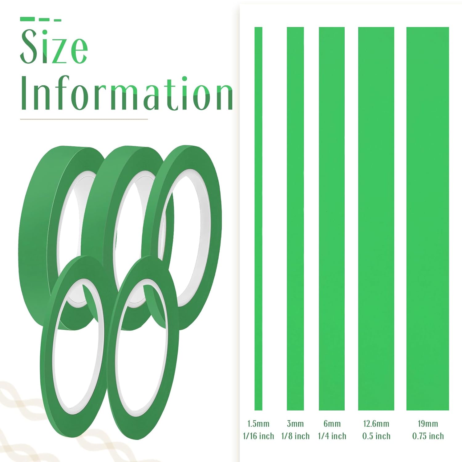 Xuniea 5 Rolls of Vinyl Tape Masking Tape Automotive Car Auto Paint for Curves, High Temperature Vinyl Low Tack(1/16 Inch, 1/8 Inch, 1/4 Inch, 1/2 Inch, 3/4 Inch,Green)