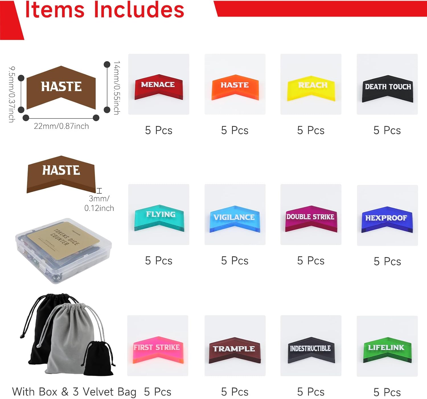 - MTG Counter Set Includes: 60pcs MTG counters keywords tokens & 70pcs MTG dice set.MTG counters keywords tokens:5x Reach, 5x Lifelink, 5x Deathtouch, 5x Menace, 5x Trample, 5x Flying, 5x Vigilance, 5x First Strike, 5x Double Strike, 5x Indestructible, 5x Hexproof, 5x Haste,MTG Dice:24pcs -1~-6 & 24pcs +1~+6, 8pcs black shield dice (4pcs 1~6 & 4pcs 7~12), 7pcs 1~6 dices and 7pcs D20 dices.