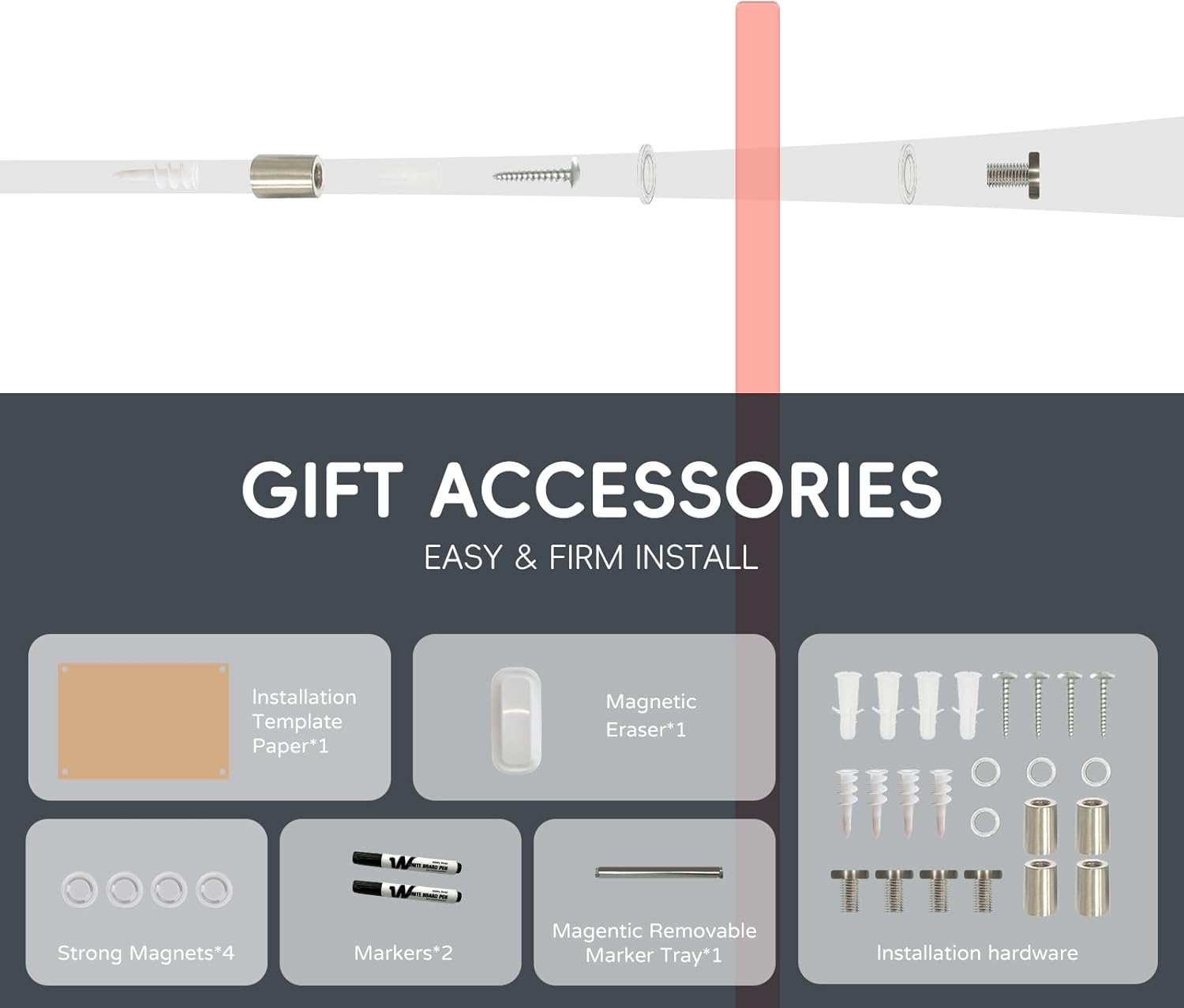 - Effortless Installation: Installing your glass whiteboard is a breeze with our comprehensive mounting kit and step-by-step instructions. The pass-through mounting system allows you to secure the board vertically or horizontally, providing flexibility to fit your specific space and needs.