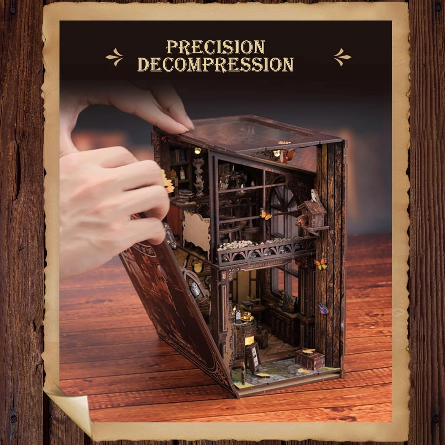- 3D Wooden Puzzles Book Nook Kit - Café: Step into a tranquil two-story café with the DIY booknook. An elderly barista with a white beard brews coffee amidst murals and books, blending art and coffee perfectly. Upstairs, a gently swaying chandelier casts soft light throughout. A cozy sofa sits bathed in warm glow, surrounded by a variety of books and the soothing hooting of owls, making time seem to slow. Intricate details bring this enchanting miniature café vividly to life