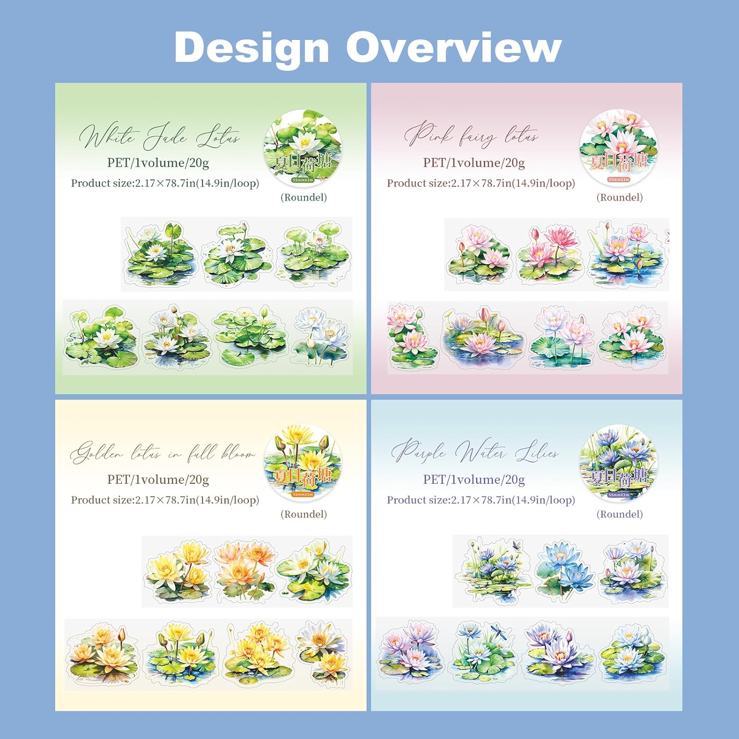 - Elegant Lotus Pond Design: This PET tape set features four unique rolls adorned with beautiful lotus flowers, floating leaves, and tranquil water reflections, bringing a serene and artistic touch to your scrapbooks, journals, and DIY projects. Comes with an additional metal clip for easy organization and use